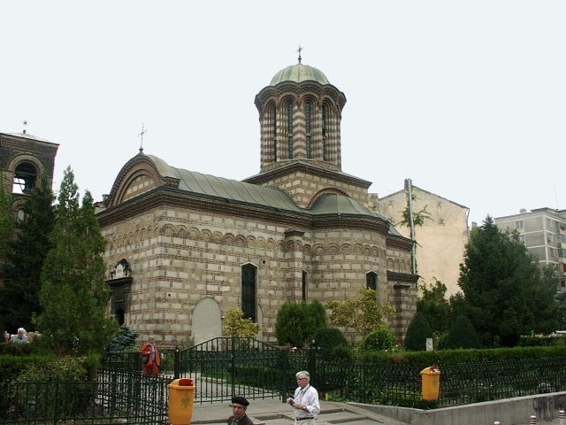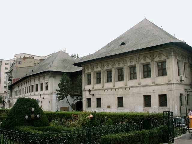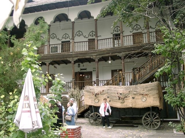Further down the Square was the oddest building. Several stories of modern glass and steel were being added atop what looked like a 19th century church. Our guide said the building was to house an architects' group. Back on the bus, we drove back through University Square, past the old Cretulescu Church, and into the very oldest part of the city, where the first major settlement began. We parked near the Dambovita River and walked a short distance to the Manuc Inn (1808), Budapest's oldest inn. It was described to us as a caravanserai (an inn where caravans rested overnight, with a central courtyard for the animals and wagons). And in fact, it bore a strong resemblance to the caravanserai we'd seen in Kusadasi, Turkey.