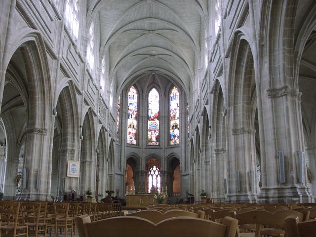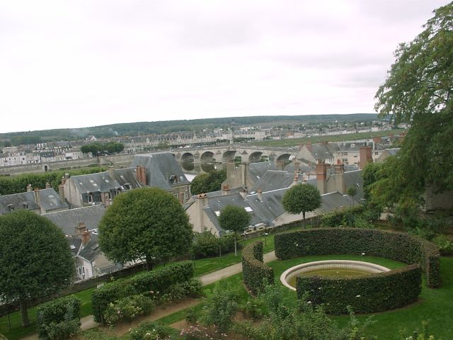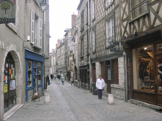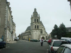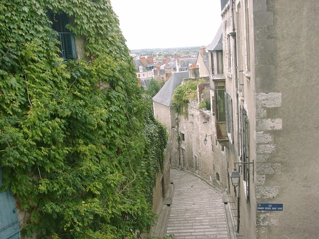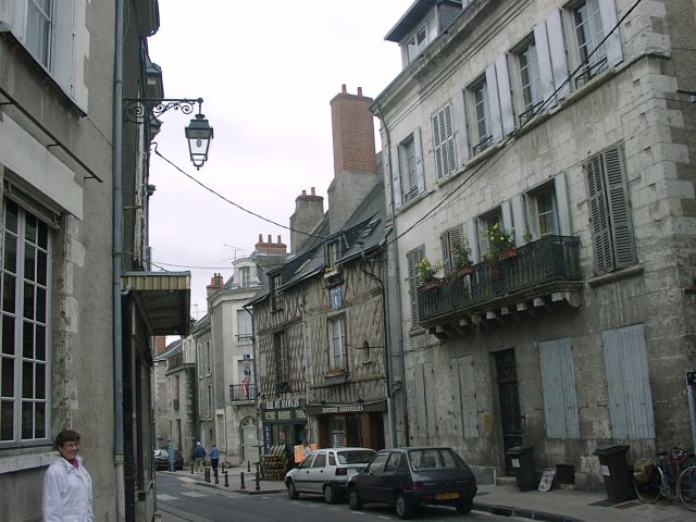 Tuesday, 28 September (cont.). After the tour, we were on our own until dinner. Jane and I stopped at a shop just outside the Chateau to buy post cards and souvenirs. A bit further along, we bought hot sandwiches and went to a park across the street to eat lunch. Then we walked to the 17th century St. Louis Cathedral, like the Chateau, situated on a high hill. Behind the Cathedral was the Hotel de Ville (City Hall), formerly the Bishop's Palace (1700). Just beyond that was the Bishop's gardens, now a park, with a great view of the town, the river, and the bridge. We rested for a while on a bench in the park. I left briefly to continue up the hill to the Halle au Grain (Grain Market) while Jane talked to another couple from our group. We then walked down the quaint, narrow Rue Pierre de Blois, back into the center of town. Jane was craving a soft ice cream, but we could not