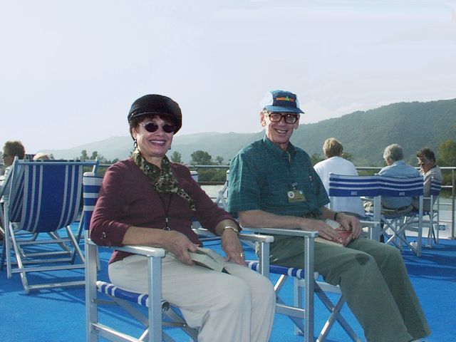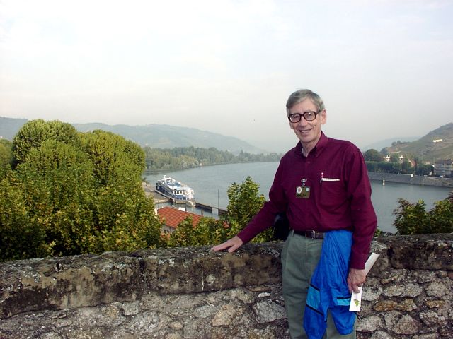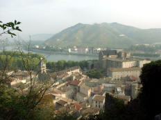 visiting Viviers but could not recognize anything.) The climb to the cathedral was easier than the walk behind Tournon had been. It was entirely through the town's narrow streets and included many steps. The cathedral itself (1822?) was unremarkable, but the setting high above the town and the river was imposing. There was actually a large, flat area a short distance from the cathedral, like a small plateau. It was surrounded by a stone wall and overlooked the town. We got back to the ship just in time for dinner at 7:00. There was a port talk at 9:00, followed by the hilarious hour-long crew show.