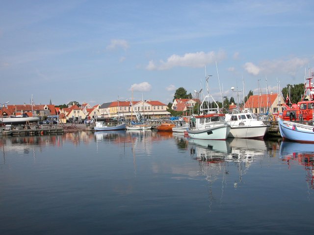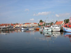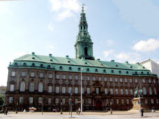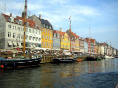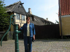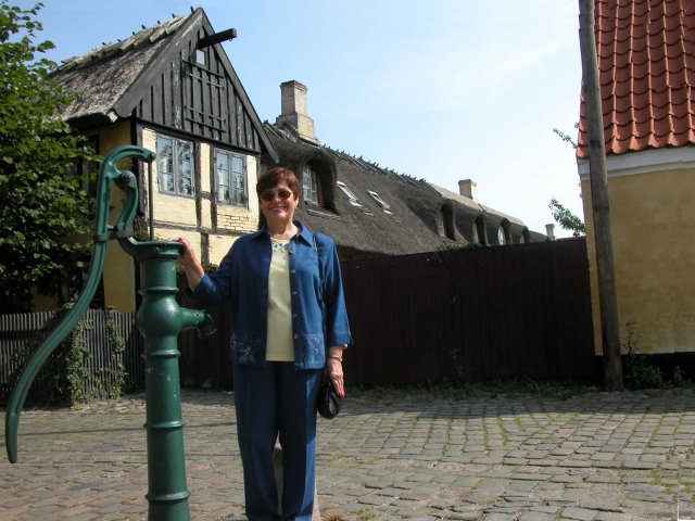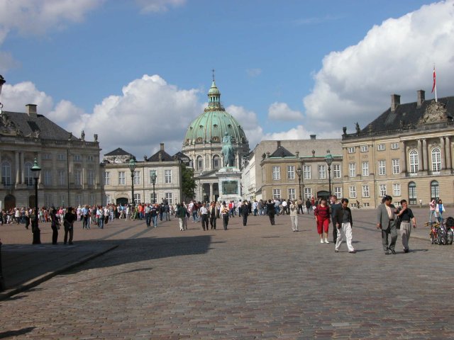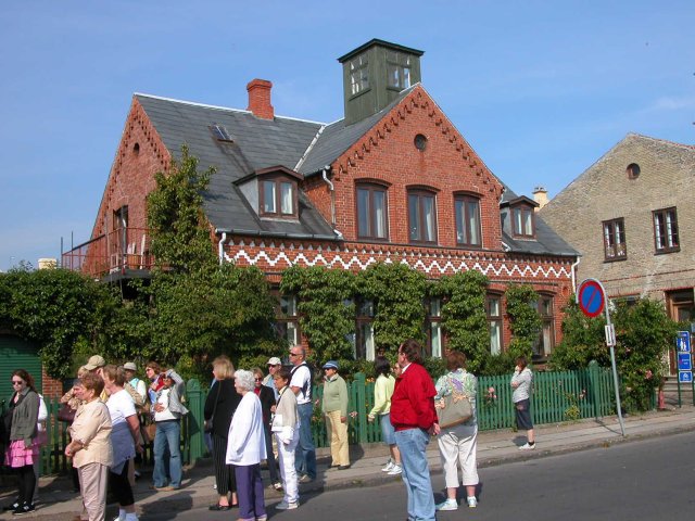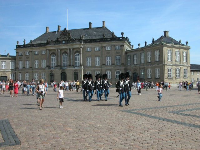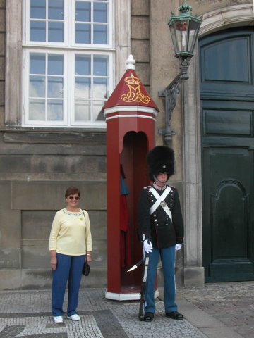 The bus then took us to Amager Island, a short way out of the city, to visit Dragor (pronounced Drauer), a small village founded by Dutch settlers about 1520. It was a charming place with a picturesque little harbor, thatched roof houses, cobblestone streets, and narrow lanes lined with hollyhocks. After walking through the village, we all had strudel and tea at a café on the harbor. We drove back into the city to Amalienborg Palace in time for the informal changing of the guard at noon (not the elaborate formal ceremony). This Palace is made up of four identical buildings, each housing members of the royal family.