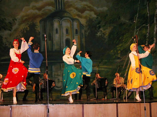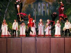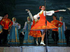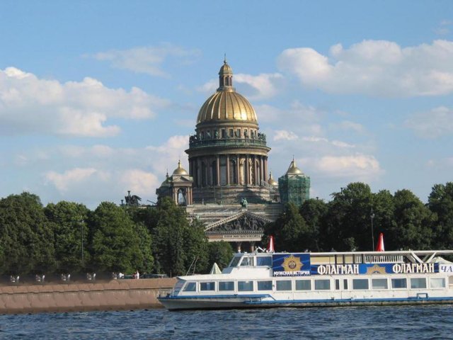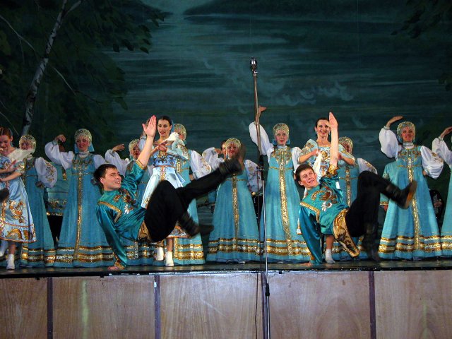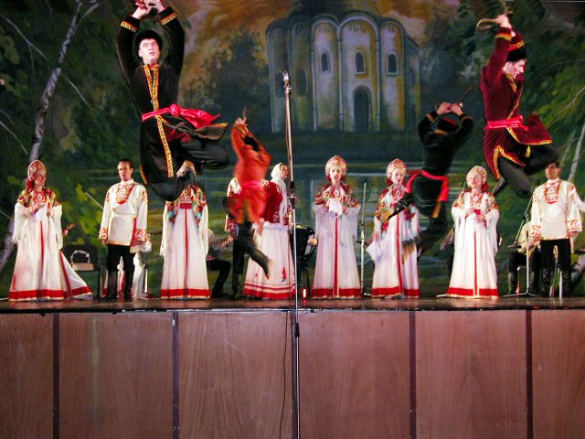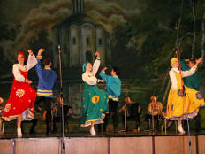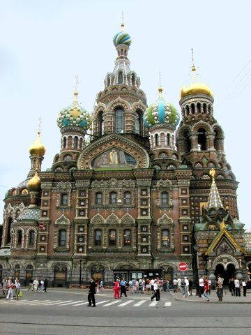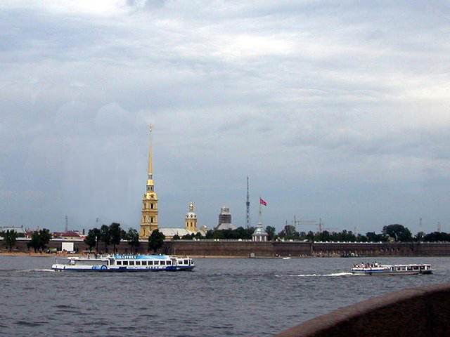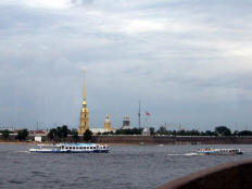 ST. PETERSBURG Saturday, 20 August. We were half way through the cruise. The ship arrived in St. Petersburg, Russia, at 7:00, but we slept late. We had spent three days in the city in 2002 (as part of a 14-day Russian river cruise), and most of the ship’s excursions visited places we’d already seen. We were glad for the opportunity to relax on board. After breakfast, Jane walked a mile on the 1/5 mile track while I ran two miles. Then she went to the spa on deck to use the thalassotherapy pool while I went to the gym. We had a light lunch and spent some time reading. We ate dinner early so we could catch the bus at 7:20 for the Russian Folkloric Show. On our way through the city, we passed the Hermitage and the Peter and Paul Fortress, among others.