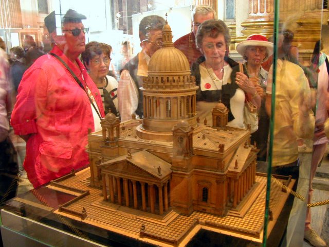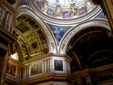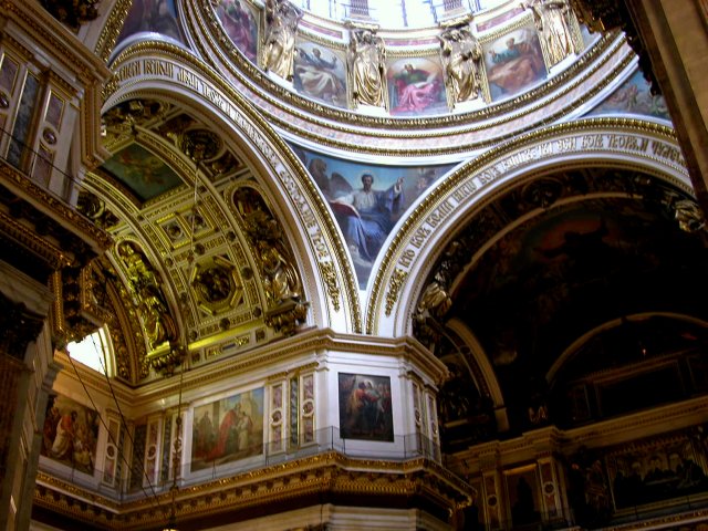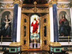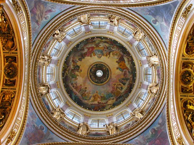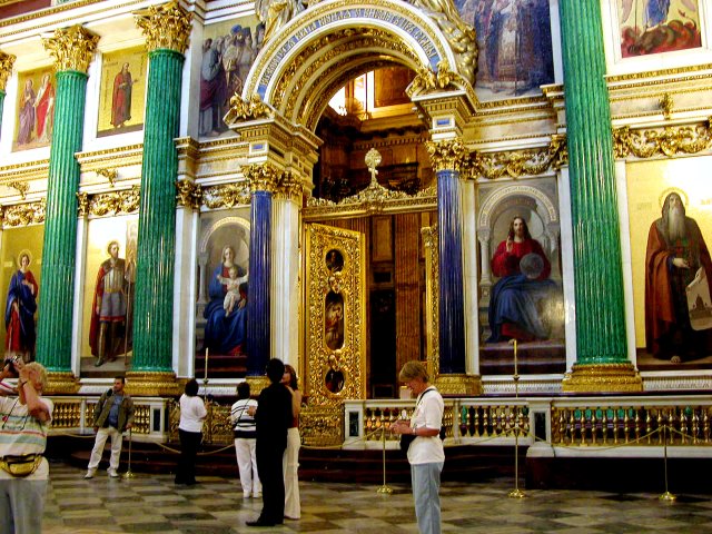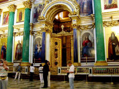 Each bus of our tour departed as it filled up, so we actually left early. Our bus tour took us first to St. Isaac’s Cathedral (1858). We had been here in 2002 but had not been able to go inside. That was the attraction of today’s tour. The Cathedral was fairly crowded inside. Before giving us 20 minutes on our own, our local guide led us around as she pointed out various features of special interest, beginning with a wooden scale model and the massive bronze doors. The entire interior was elaborately decorated with rich mosaics and paintings, and the huge dome was especially impressive. But the iconastasis (the icon wall that separates the altar from the rest of the church), with eight malachite and two lapis lazuli columns, was clearly the show-stopper. When used as a church (It’s now a museum), St. Isaac’s could accommodate 14,000 people.