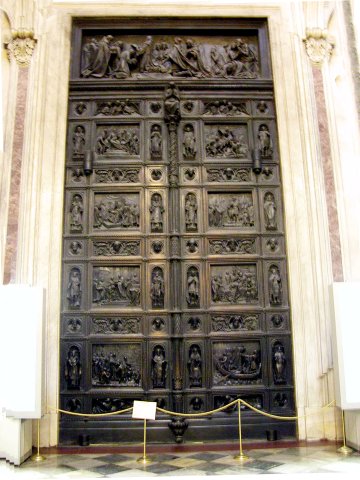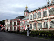 Our next stop was the Alexander Nevsky Monastery. (Nevsky is the patron saint of the city, Nevsky Prospect its main street.) This complex contains the Church of the Annunciation, Trinity Cathedral, a Seminary, the Communion Building, and the Metropolitan House, as well as the famous Tikhvin Cemetery. The heavy rain had stopped, but there still was a light mist.