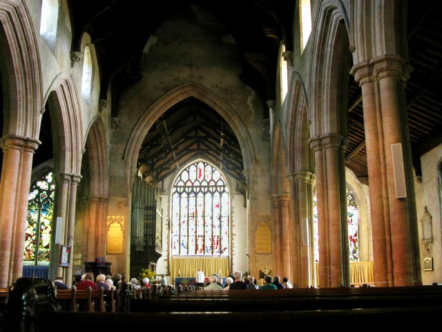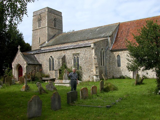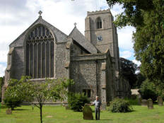 It turned out to be a bit more complicated than I realized because, after we passed Norwich, there was no turnoff on the motorway until we were well past Hingham. We had to make our way back to it on some very narrow country lanes, arriving at St. Andrew’s Church in Hingham about 10:45, at least half an hour later than we had planned. The church, with walls made of “flint and rubble,” dates from the mid-14th century. By luck, the Sunday service was still in progress, and about 30 people were in attendance. When the service ended (a little after 11:00), we were warmly greeted by the rector and joined several of the parishioners for tea. Robert Peck (1580-1656), the brother of my ancestor Joseph Peck, was twice the rector of this church. In between his terms, he led a group of parishioners to America in 1638. St. Andrew’s is very proud of this connection to America (as well as the 1622 baptism here of Samuel Lincoln, an ancestor of Abraham Lincoln).
