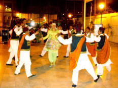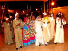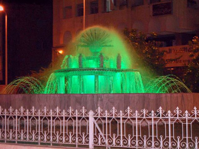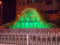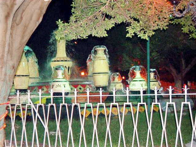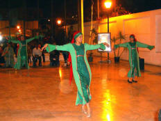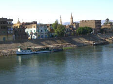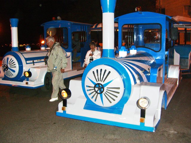 There also were flat low fields, barely inches above the level of the river, that I would expect to have been very marshy, soft and wet. Yet they were thickly covered with grasses or crops, cattle grazed there, and farmers walked across them, all as if they were on solid ground. It was a common sight in the larger villages we passed to have a church steeple, topped by a prominent cross, right next to the mosque. In one town there were two churches near the only mosque. Our ship finally arrived at Qena at 17:30. This is the provincial capital and an important commercial city, having both a bridge over the Nile and a rail connection to the Red Sea. It is also known for its pottery, especially the porous clay water jars (kulal) still used in most Egyptian households to cool water by evaporation. All the passengers were invited to the lounge for a welcome drink (including Egyptian wine) at 16:15 while the crew (Captain and supervisors only) was introduced. This was followed by the evening port talk, then dinner at 19:00. At 20:30 we all boarded "chou-chou trains" that were to take us into Qena for folk dancing show. We noticed several small trucks loaded with tourist police, somewhat more conspicuous here than those in Cairo had been. At least four trucks joined the convoy of little trains: one led the convoy, and one followed each of the three trains. Every single street we crossed (and there were dozens of them) was blocked on both sides by a policeman. Some tourists were attacked by terrorists here in 1992, and I guess they've been protected like this ever since. Even aside from the small army protecting us. it was an interesting ride. Along much of the route the street was lined with local residents, mostly young boys, wildly cheering us as we passed. Even as we drove through the heart of downtown, the shoppers on the sidewalks waved energetically. The drive also took us by several beautiful fountains and some very attractive buildings.
