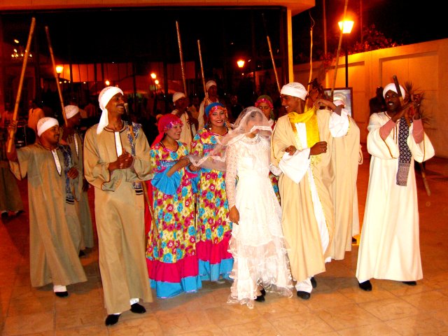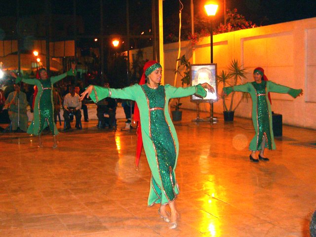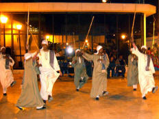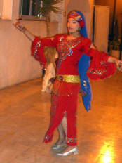 The show was to be at a "girls school" and we arrived there shortly before 21:00. The setting resembled a night club, with perhaps fifty tables lined up in front of what appeared to be a dance floor rather than a stage. Most of the performers were men, perhaps a dozen, but there were four young women, too. The costumes were colorful and the dances lively, but not like any folk dances we'd seen before. Apparently most of the dances were telling a story, and we could see that the last few tied together to depict events leading up to a wedding. We enjoyed the evening very much. The show lasted an hour, then we boarded our trains again for the ride back to the ship. By now it was after 22:00, and there were few people on the streets besides the ubiquitous tourist police. The night was pleasantly cool, but still much warmer than it had been in Cairo. We were back at the ship in less than 15 minutes. | ||||