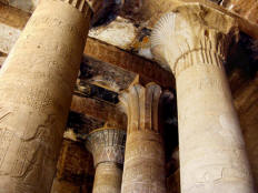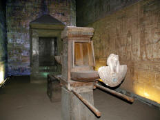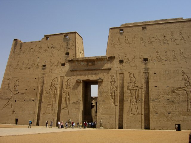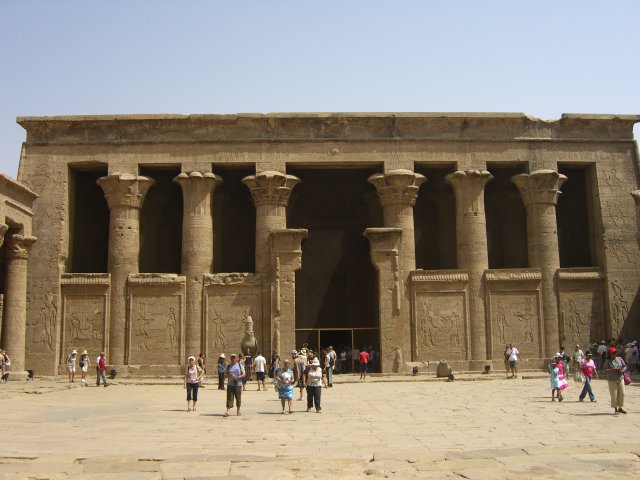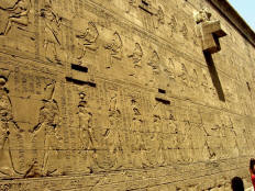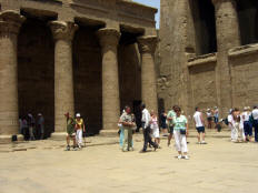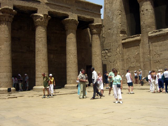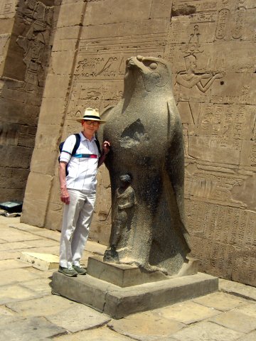 Our bus left at 9:30 for the Temple of Horus. This is the second largest temple in Egypt (after Karnack), and the best preserved. That's may be because it's one of "newest," begun by Ptolemy III in 237 B.C. with construction continuing until the time of Cleopatra, the last pharaoh. (She, like all the Ptolomy pharaohs before her, was Greek, not Egyptian.) The weather was beastly hot and this area swarmed with both people and flies. We persevered through Salah's lecture as he guided us through the first courtyard and into the hypostyle hall (with relatively few columns, nowhere near the scale of the grand hall at Karnak, but this one still had its roof). When he turned us loose, we literally fought our way through the pressing crowd to see the Horus Boat in the sanctuary. (Even the normally easy-going Italian tourists were aggressive and rude.) By the time we fought our way back out, Jane was feeling very ill.