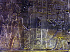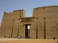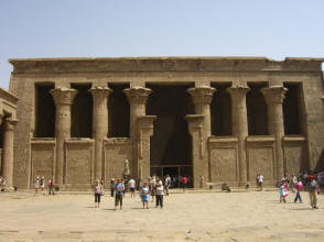 We walked to the air conditioned Visitor Center and found it deserted except for a very pleasant young attendant. After Jane used the bathroom, he guided us to front row seats in a huge, but empty, theater, gave us cold bottled water, and proceeded to turn on a very interesting slide show about the temple, complete with English narration. He even reran those slides I tried to photograph (with dismal results). When it was over and we had to leave to catch our bus, he made no request for baksheesh, and in fact declined my first offer of a few pounds (but not the second). He left us with a most favorable impression of what until then had been a very unpleasant experience. Jane felt much better after that. Our bus left at 11:30 to take us back to the ship. The ship sailed south for Kom Ombe about 12:30. After lunch we rested and read until time for the Inner Circle (frequent GCT traveler) cocktail reception at 16:00. The Tour Directors solicited comments on the tour, sparking some heated discussion, especially about the luggage handling and long delay at the Cairo airport when we first arrived. We were still hot at it when the other passengers arrived for the 17:30 port talk. Page 1 2 3 4 5 6 7 8 9 10 11 12 13 14 15 16 17 18 19 [History]