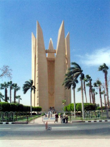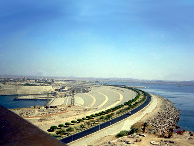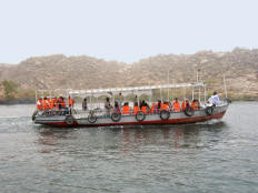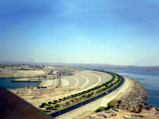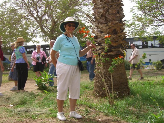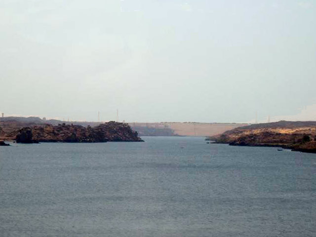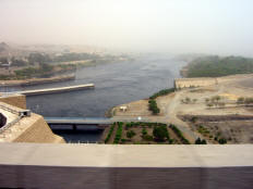 On the way to the High Dam we passed the recently renovated Coptic Cathedral, Just after that, we crossed over to the west bank on the earlier, British-built Aswan Dam, completed in 1902 (but raised twice after that). It's still in operation but is dwarfed by the Soviet-built dam a few miles upstream. Completed in 1970, the High Dam was designed to prevent flooding, generate electricity, and provide water for agriculture. It's 2.3 miles long and 364 feet tall. The reservoir behind it, named Lake Nasser, is hundreds of miles long. The bus drove us all the way across the High Dam, where we could see the Lotus Monument that commemorates construction of the dam. Then the driver made a U-turn and took us back to the middle of the dam where he dropped us off . The dam is about 130 feet wide with a two-lane highway flanked by a broad grassy park with lots of trees, so you'd never guess that you were on a dam. We had half an hour to explore on our own. The sun was out and the haze was gradually clearing, but we still couldn't see much at any distance.