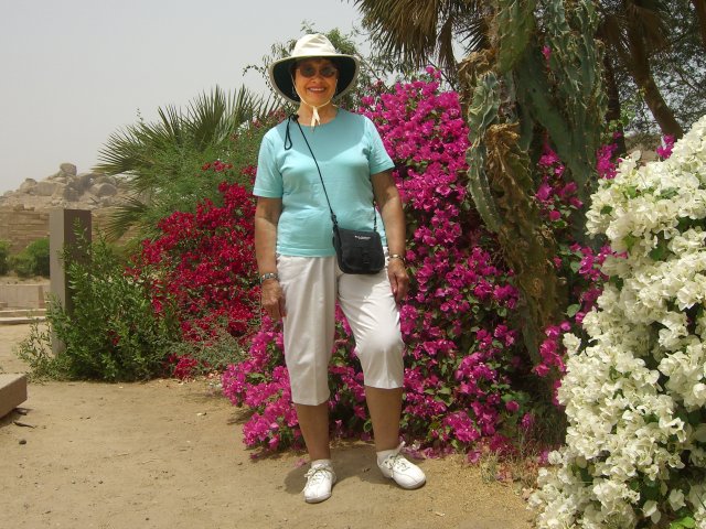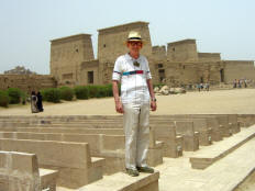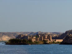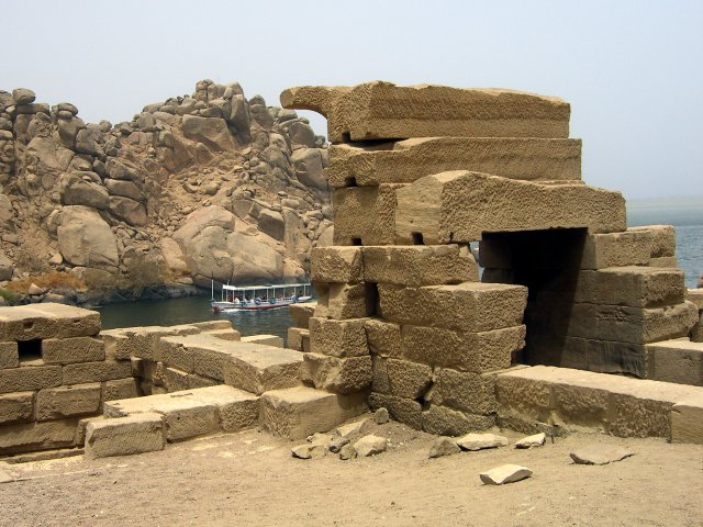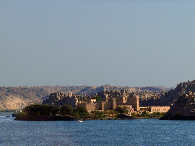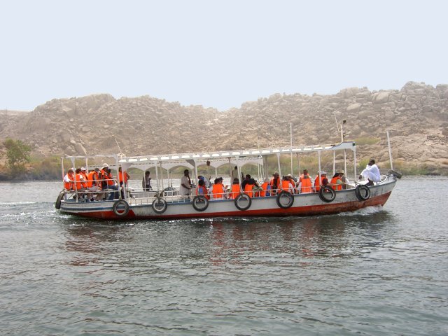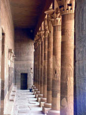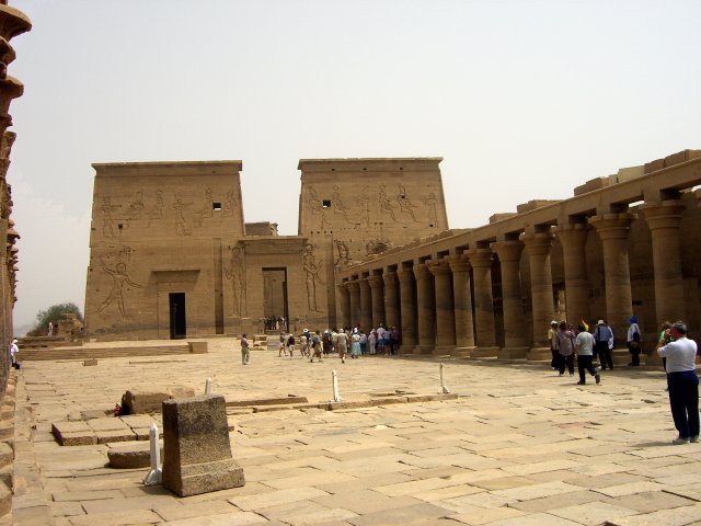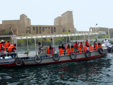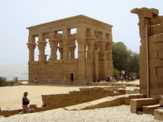 Our bus left at 10:00 to take us to our next excursion, a visit to the Temple of Philae. This temple complex is relatively recent, constructed mostly in Greco-Roman times. It originally stood on the sacred island of Philae in the Nile. With the construction of the 1902 British dam downstream, the island and much of the temple was submerged during the winter months, then reemerged in the summer as the water behind the dam was used for irrigation. When the High Dam was completed upstream in 1970, the island was constantly submerged between the two dams. Fortunately, the temple was later dismantled and rebuilt on a nearby island (Agilkia), reshaped to resemble the original island and renamed Philae. The bus dropped us near a landing where many boats and many tourists were waiting. We first put on the life vests that we'd brought with us from the Anuket, then we boarded, about 30 to a boat. The haze was completely gone and it was a gorgeous day for a boat ride. Approaching the temple by water gave us an especially beautiful perspective. The boat landing was adjacent to the Vestibule of Nectanebos I, a wide area flanked by a row of columns on each side and leading to the first pylon. The temple complex was relatively small (only two pylons & one courtyard) but very interesting. The main temple was dedicated to Isis, but there were a number of side temples. Beyond the second pylon was a small hypostyle hall with beautiful columns. Away from the Temple of Isis and near the opposite shore stood Trajan's Kiosk, an exquisite structure named after the Roman Emperor.