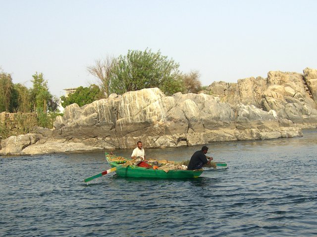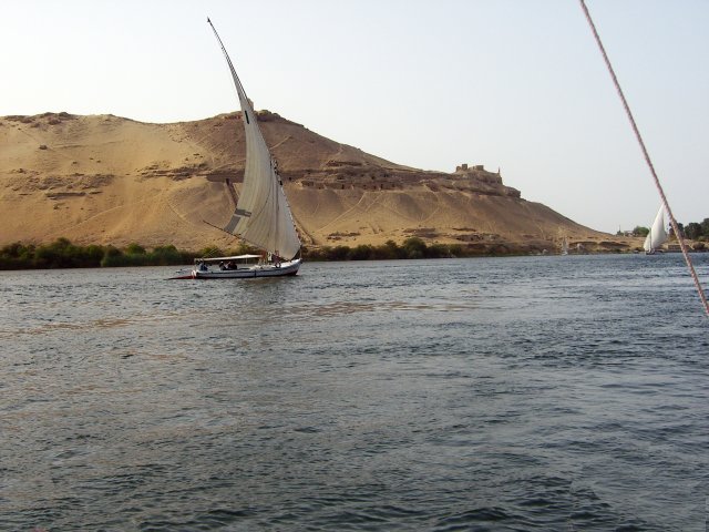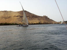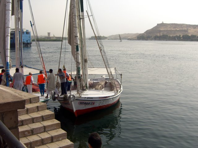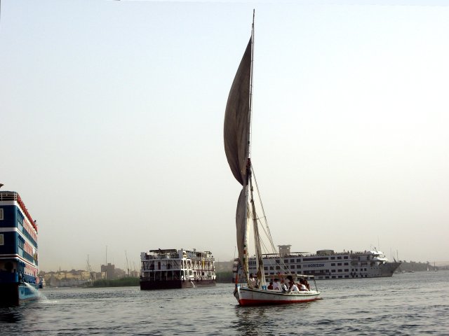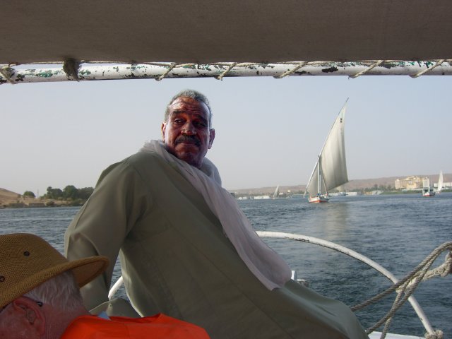 The bus got us back to the ship about 13:10, and we had lunch at 13:30. We rested until 15:30 when we walked a few yards from the ship to go for a sail in a felucca. These small boats with a triangular sail and primitive rudder/tiller hold about 20 passengers and a crew of two. As we sailed, there were several other feluccas, motorized tourists boats and a couple of cruise ships out in the water with us. With the wind at our backs, we virtually flew towards the group of islands to the south. Despite our speed, a small boy in an innertube (and singing "Row, Row, Row Your Boat") managed to grab onto our felucca, hoping for baksheesh no doubt. He dropped off as we circled one of the smaller ones (next to Kitchener's Island) and started back toward the ship. What a difference! We were now heading into the wind and had to tack constantly in a fairly narrow channel. There was a small row boat in our way, too. We made very little headway. Eventually we got clear of the islands and, with more room to maneuver, were able to reach our ship at about 17:00.