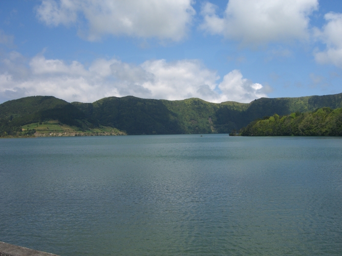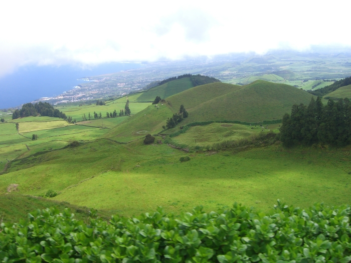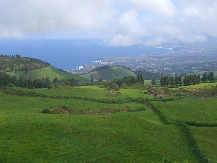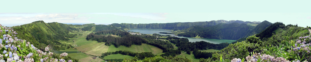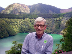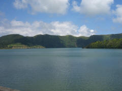Page 1 2 3 4 5 6 7 8 9 10 11 12 Saturday, 2 May (p.m.). Our tour to Sete Cidades left at 12:30. The island of Sao Miguel apparently was formed by two volcanoes whose lava flows eventually connected them. So there is a large volcano on each end of the island, and there was a tour to each of them. We had chosen the tour to Sete Cidades on the west side, said to be one of the most beautiful natural settings in the Azores. It's the most popular national park in the islands.