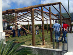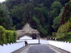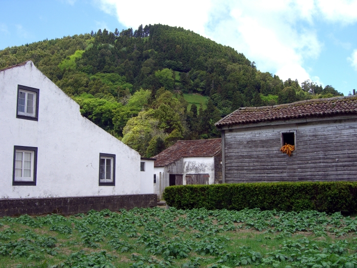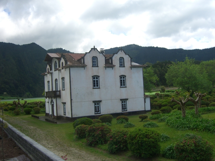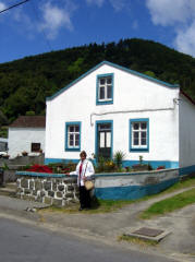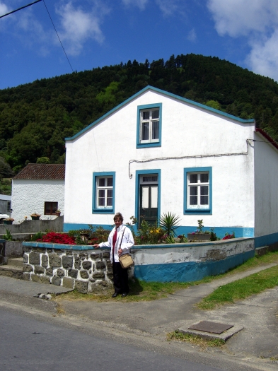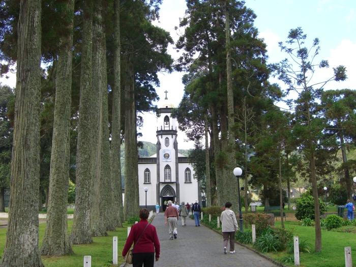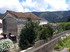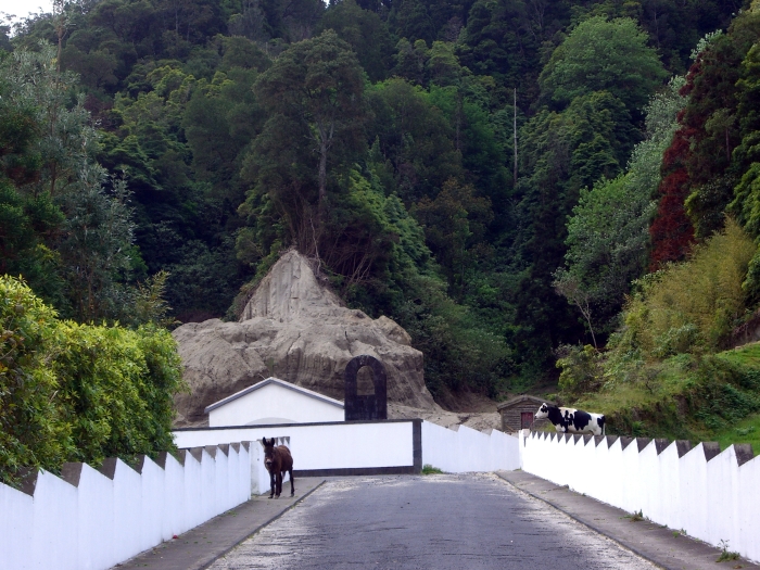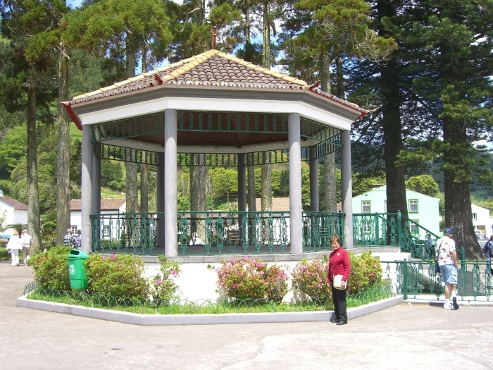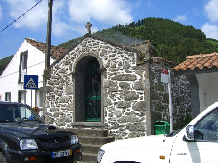 The bus wound its way down the steep road to the small village of Sete Cidades (pop. <900). (That means Seven Cities, but there is only the one village.) We got off the bus near a bandstand in what was probably the village's main square, and we had about 45 minutes to explore on our own. There was a little church nearby and an even smaller chapel across the street. Most of the houses were very small. The village men were erecting some kind of log structure, probably temporary for some festival from the looks of it.
