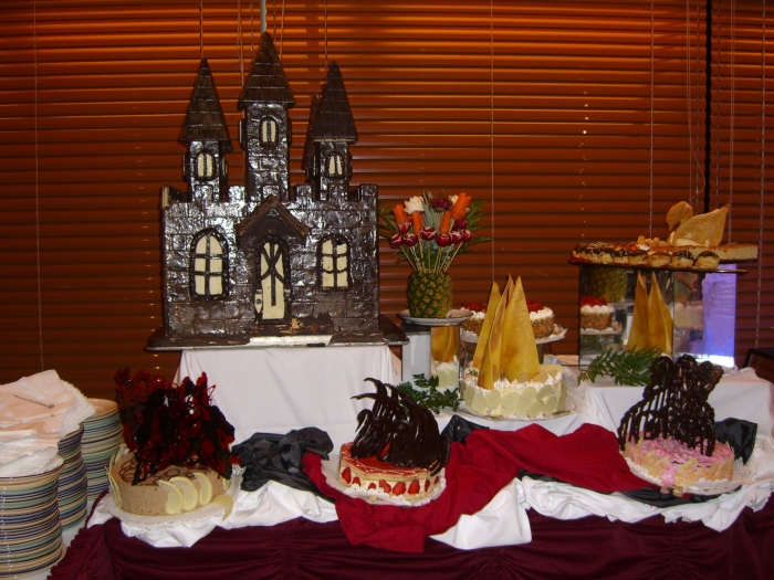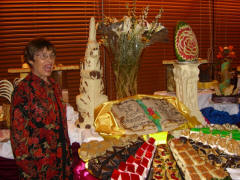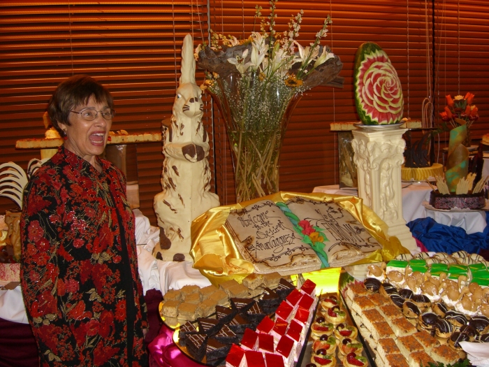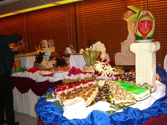 Page 1 2 3 4 5 6 7 8 9 10 11 12 Wednesday, 6 May. We lost another hour during the night, but again it didn't matter because this was a day at sea. It seemed that we had been setting our clocks ahead faster than the sun really required, because dusk was now falling after 10:00 p.m. We slept until 8:00 a.m. The day was sunny but windy and cool (high of 60). We read much of the morning and in the afternoon I went to the gym, and Jane went to the Spa for a special combination available today. We attended the 8:00 p.m. show featuring Count Dimas (from Transylvania!), an excellent pianist and a comedian as well. Then we stayed up to see the Dessert Extravaganza at 11:00 (not a Chocolate Extravaganza as the cruise brochure had advertised, although there still was plenty of chocolate). The first half hour was "display only" so everyone could see the elaborate desserts before any of them were served. This was pretty late for us, and we just took a quick walk through and didn't wait to eat anything.