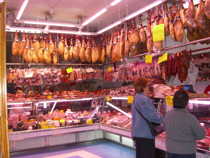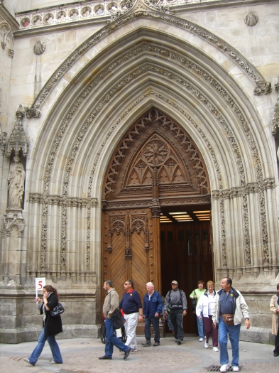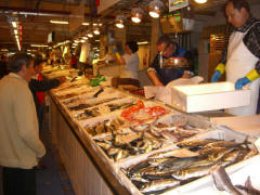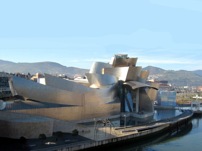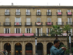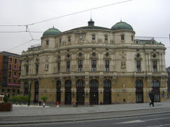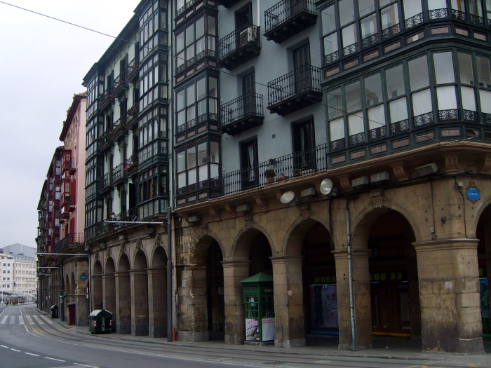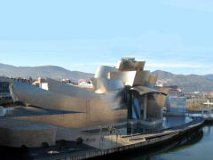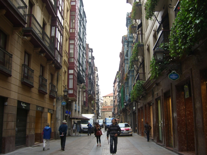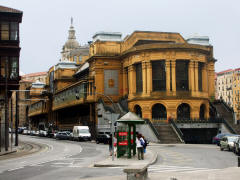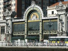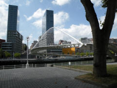 Thursday, 7 May (a.m.). The ship sailed up the Nervio River and docked at Bilbao, Spain, at 8:00 a.m. This was our first visit to the northern coast of Spain and the Basque Country. In its largest sense, the Basque Country is made up of seven traditional regions: four provinces in Spain and three regions in France. However, under Spanish law, three of the the four Spanish Basque provinces (Alava, Biscay, and Gipuzcoa) compose an autonomous community that is also designated as the Basque Country, so the term can be confusing. The day started out overcast, windy and cool (high 60), but the sun peeked through now and then later on. We had signed up for a 9:00 bus tour of Bilbao and the neighboring port town of Castro Urdiales. Bilbao, with about a million people in its metropolitan area, is the largest city in the Basque Country of northern Spain and is the capital of the province of Biscay. It has undergone quite a revival in recent years and boasts such modern architectural attractions as the Guggenheim Bilbao Museum (by Frank Gehry) and the White Bridge (by Santiago Calatrava). Our bus tour took us by both of these. We had debated taking the tour that included the interior of the Guggenheim. (Others who did that said it was a great disappointment because the interior was "barren.") We got off the bus near the Concordia Station and spent 40 minutes walking through the Casco Viejo (old neighborhood), including visits to the Plaza Nueva, Santiago Cathedral, and the Public Market along the river (Mercado de la Ribera). [Ribera means "along the river" (cf. riviera).] We had a short time on our own before we had to be back to bus at 11:00. | ||||||