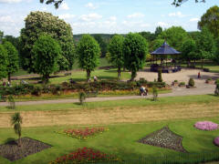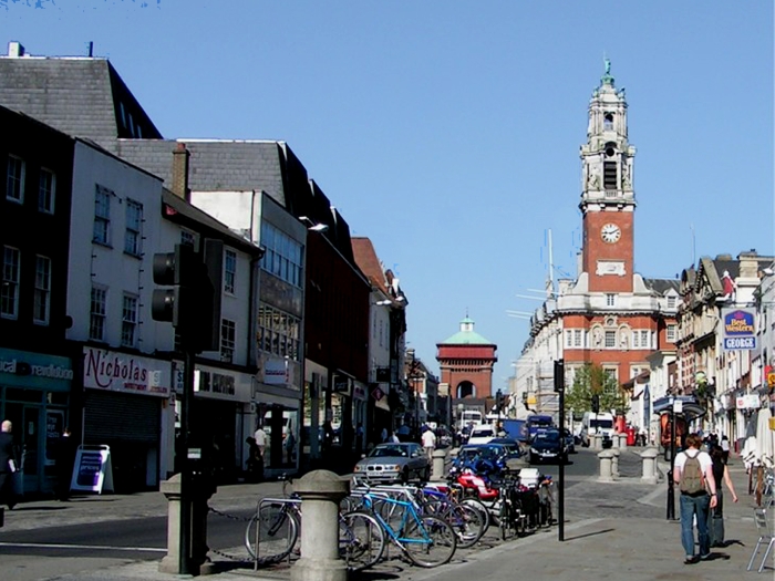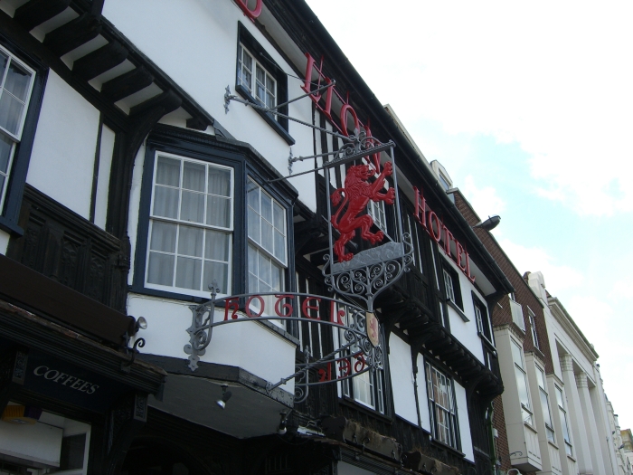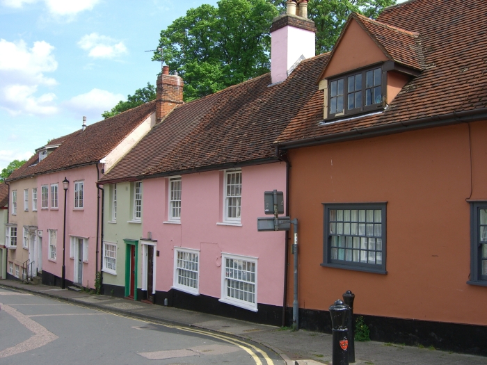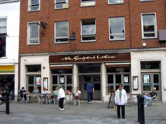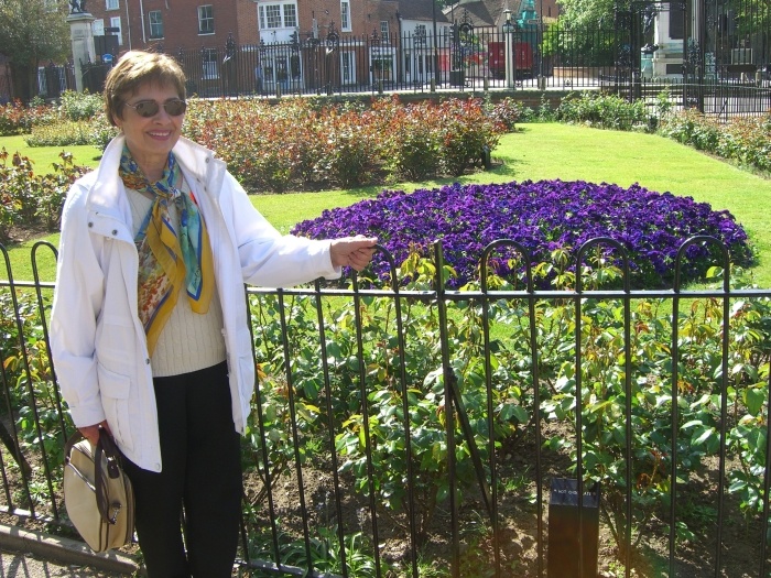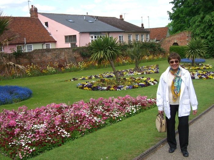 Exiting the Castle, we had a few minutes before the group reassembled, so we walked to a nearby coffee shop and each had a latte. Then we joined the group for a walk to the garden (now a park) behind the Castle. From there our guide led us through the Dutch Quarter, so named for the cloth weavers imported from the Netherlands (16th century) when the English coveted their skills. Although old, most of the homes were so well maintained that they looked quite modern. Among the houses was the one-time home of Jane Parker, who wrote "Twinkle, Twinkle Little Star." We continued our walking tour to High Street, the main drag, then were turned loose for half an hour of exploring. Of course, I had to get a shot of Jane in front of The Slug and Lettuce. Our bus was still parked near Colchester Castle so, on our way there, we spent some of our free time exploring Castle Park