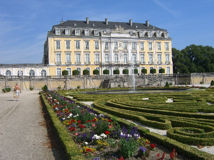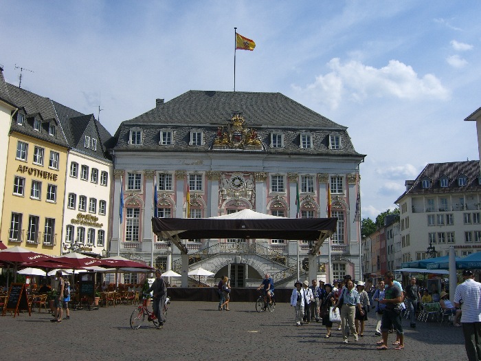 Friday, 7 August. It was another warm sunny day as we woke up in Bonn. Jane was still weak but decided she didn't want to use a wheelchair for our optional tour to the Augustusburg Palace, half an hour away. Built by the Archbishop/Elector of Cologne (early 18th century), the Palace more recently was used for state guests while Bonn was the capitol of West Germany. The Palace was disappointing for us, perhaps because we have seen so many palaces, many far more grand and opulent.