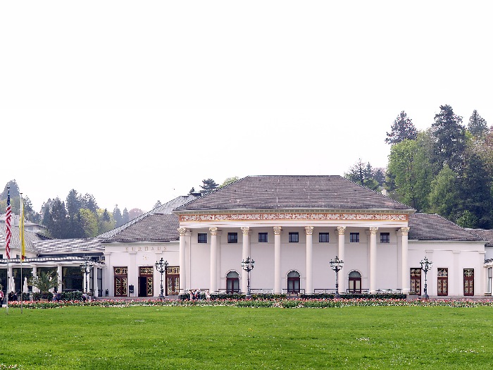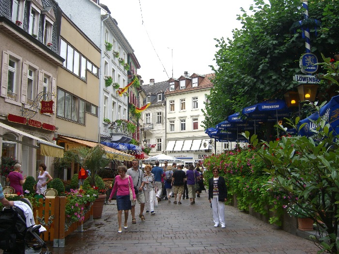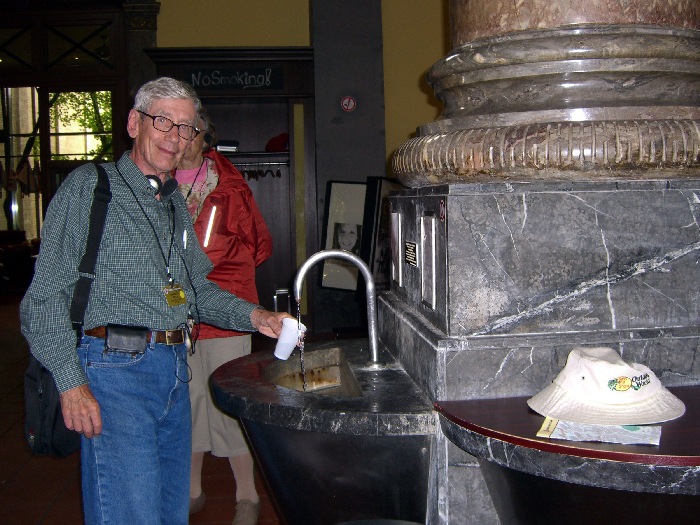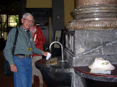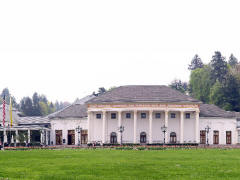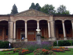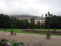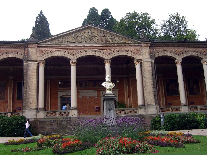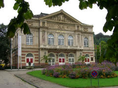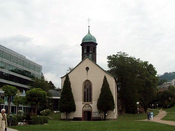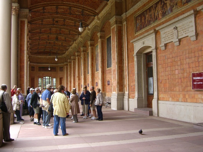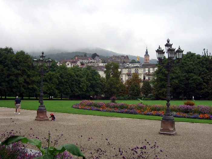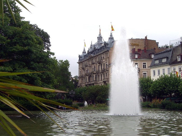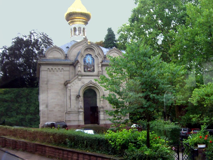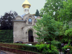 Page 1 2 3 4 5 6 7 8 9 10 11 12 13 14 15 16 17 Friday, 14 August (a.m.). The ship arrived at Greffern, Germany, about 8:00. It stopped here only to discharge those of us going on the optional tour to Baden-Baden. The buses picked us up at 8:30 and the ship sailed on for Strasbourg. It was another cool, overcast day, this time with a steady rain. The bus ride to Baden-Baden was designed to take us on secondary roads through a beautiful, mountainous section of the Black Forest, passing through Lichtental. Despite the rain and heavy fog, that is the route we took. We couldn't see a thing, and half the time the driver couldn't even see the road. The drive took a full hour. We passed a Russian church on our way into town, built when the czars used to come here. The bus dropped us off at Ludwig Wilhelm Platz, about half a mile from the main "bath" facilities that give Baden-Baden its name. The rain had let up but it was still misty. We crossed a park and a small stream (the Oosbach) and finally came to the Casino that is part of the bath complex. We were guided inside, but the game rooms were not open. (Jane and I had visited the game rooms with some friends one evening in 1971 while stationed in Germany.) Next we were led to the Trinkhalle (Pump House?) for an opportunity to "take the waters". They're supposed to make a person younger, but we don't think they worked.