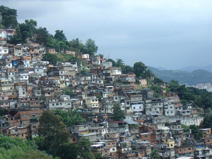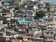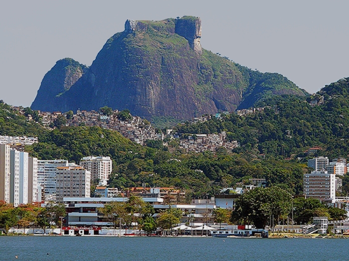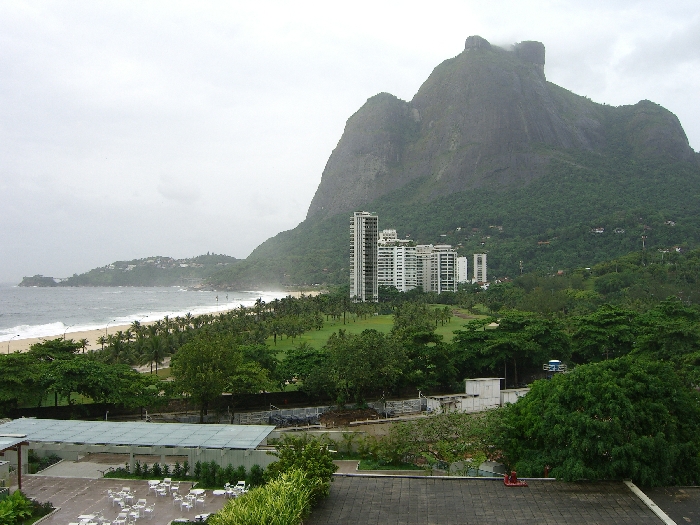The bus finally made its way to the Reboucas Tunnel that passes under Corcovado Hill. That brought us into the South Zone which made a better impression. As we emerged from the tunnel, we drove by the huge Rodrigo de Freitas Lagoon, ringed by the Jockey Club and various parks. We continued east to the Sao Conrado district, finally reaching the Intercontinental Hotel there about 1:30. Even here, a favela (Rocinha) covered a hillside not far from our hotel.