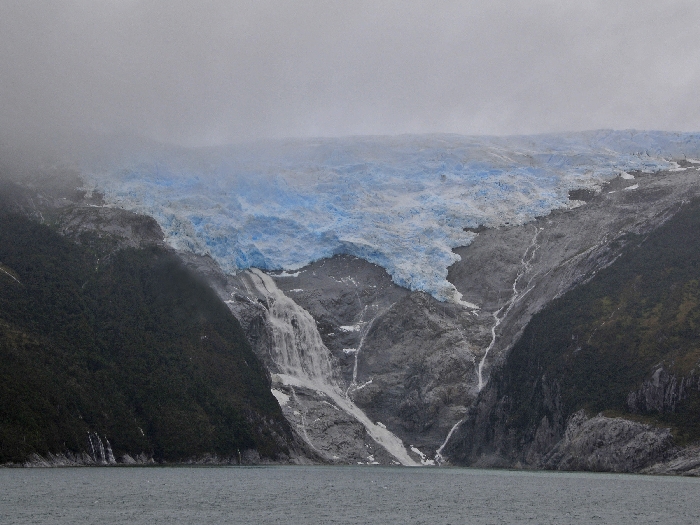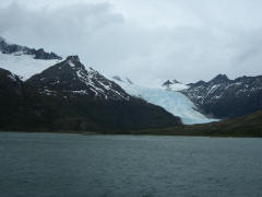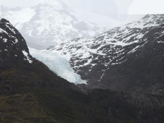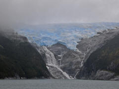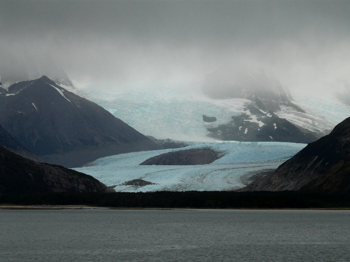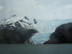 About 6:00 p.m. the ship reached a fork in the Beagle Channel and followed the northern branch, often called Glacier Alley because there are so many glaciers in a row. Fortunately, the glaciers were all on the north side (where the mountains are higher). That's the port side of the ship, so Jane could see them quite well through our window. She ate in the room while I went to the dining room, another formal night. I was careful to sit near a window on the port side so I could see each glacier as we passed. I was still on deck when we passed the Holanda Glacier about 6:15. I had just been seated in the dining room when we passed the Italia Glacier, the only one on Glacier Alley that still reaches tidewater (therefore a "tidewater glacier"). The next one, the Francia Glacier, ended in the mountains well above the Beagle Channel.