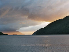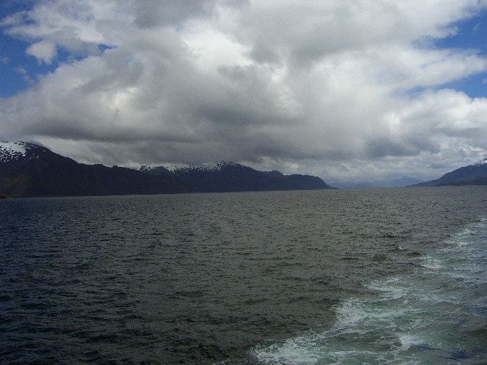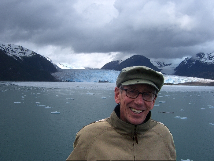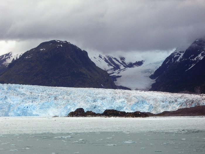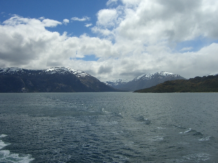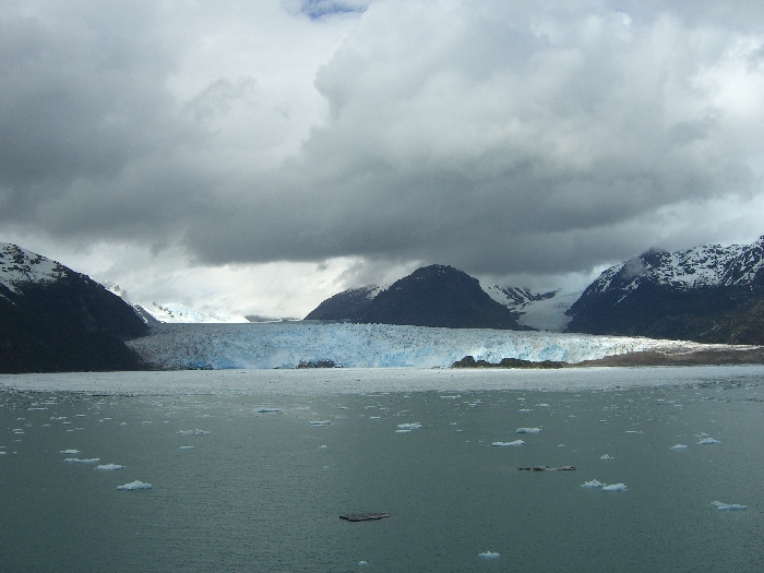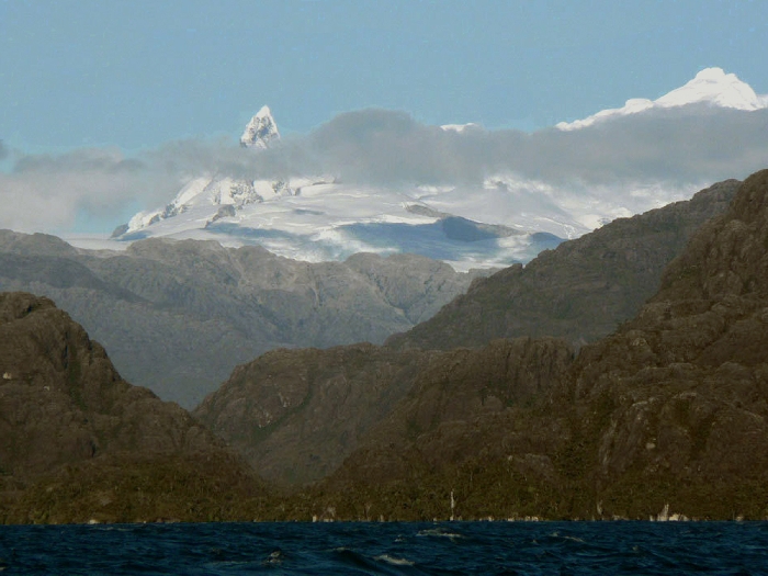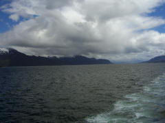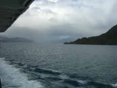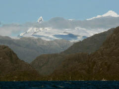 Page 1 2 3 4 5 6 7 8 9 10 11 12 13 14 15 16 17 18 INNER PASSAGE Thursday, 17 December. The Veendam must have left the Strait of Magellan around 4:00 a.m. We were not in the open waters of the Pacific, though, but in an inner passage among the many islands on the west coast of Chile. (By the time we got up, we must have been near Isla Shoalon, where the M.S. Santa Leonora was shipwrecked in 1964, but no one called our attention to the hulk as we passed it.) The width of the channel varied greatly as we sailed along. It looked very much like the Beagle Channel except there was a little less snow. This was a day at sea with "scenic cruising" according to our program. It was mostly cloudy but we saw the sun and some blue skies later on. The temperature was in the 40s. Jane was feeling weak and we had breakfast in our room. At 11:00 we went to an interesting lecture, "Fire and Ice," on the geology of South America. The official ship's position at noon had us in the Sarmiento Channel off Puerto Mayne on Isla Evans. Soon after, we left the main channel and did a "fish hook" around to the east and south, entering a closed fiord to visit the Amalia Glacier. We were worried because it started raining at this point. Fortunately it didn't last long. Amalia is a massive tidewater glacier, 21 miles long. It's somewhat unusual in that it's so wide that it seems to flow almost parallel to the shore rather than perpendicular to it. As a result, it has far more of its edge exposed than any other glacier I've ever seen. One of the mountains it partially surrounds is the Reclus Volcano. The ship stayed in front of the glacier for nearly an hour, even maneuvering around so passengers could see it from anywhere on the starboard side. That gave us a variety of pictures as the sun, the clouds, and the fog were constantly changing. The wind was very strong (50 mph) when we first arrived, but as the ship turned, it blocked much of it. Jane came on deck to see the glacier and stayed out for 40 minutes.