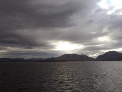 Jane and I had dinner in the dining room again and even went to the 8:00 show. The performer was Mark Donoghue, an excellent instrumentalist and singer. Friday, 18 December. Another day at sea. The ship emerged from the Messier Channel into the Gulf of Penas and, in the late morning, continued into the Pacific. It was mostly cloudy, in the mid 50s, with rough seas and intermittent rain. Jane was better and, for the first time, went with me to the Lido for breakfast. To further cheer her up, we went to the jewelry shop on board and I bought her a tanzanite and diamond pendant and earrings as her Christmas present. At 11:00 we went to the Puerto Montt port talk. Then I went to the gym. After lunch we read in the lounge. Late that afternoon the ship left the Pacific and sailed east into the Darwin Channel, then turning north to follow another inner passage. The scenery was much like we'd seen further south, beautiful but with noticeably less snow on the mountains, and the ship was much further away from the shore. We went to the formal dinner in the Rembrandt dining room and to the 8:00 show. It featured Peter Fernandez, an excellent singer with a broad repertoire, including a generous dose of Latin music. Page 1 2 3 4 5 6 7 8 9 10 11 12 13 14 15 16 17 18