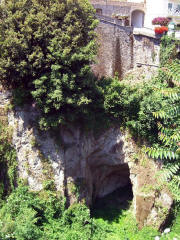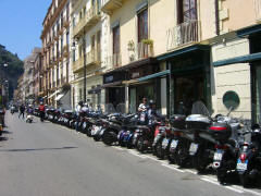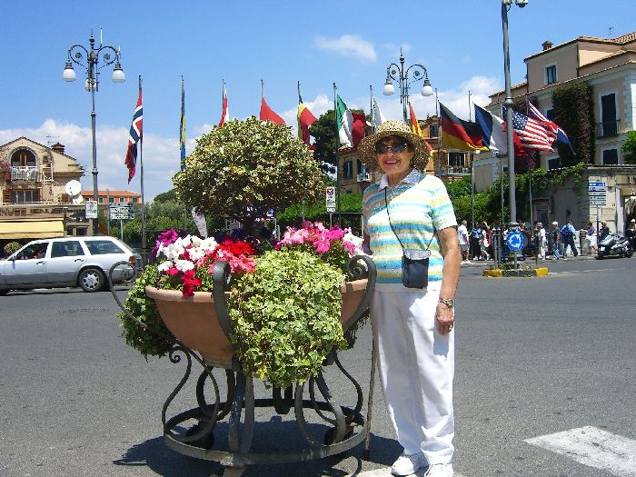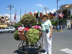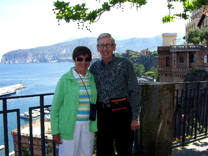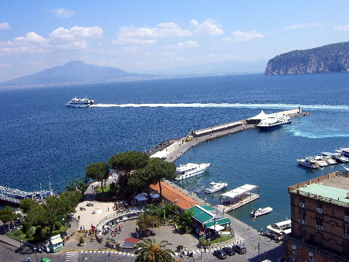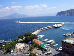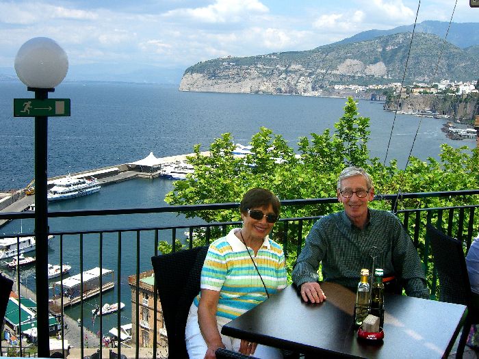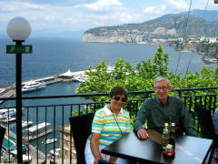 special taxi. More about that later. We walked down Corso Italia past the Cathedral, and Jane did a little last minute shopping. Then we walked to the Foreigners' Club that I'd discovered earlier when looking for a tourist office. It had a restaurant with a large patio right above the Marina Piccolo, the Terrazza delle Sirene (Terrace of the Sirens). The view of Mt. Vesuvius and the shoreline from Naples to Sorrento was spectacular. We ordered a light lunch and sat far an hour, soaking in the atmosphere. Then we went to the Villa Comunale, the overlook near our B&B, and sat on a bench until 3:45. We went back to our room and did our final packing. We went out to the street a few minutes early (3:55) and our driver (with the unusual name Sabato) was there. He was very pleasant and friendly and even spoke a little English. Although he drove a large van, we were the only passengers. We (mostly Jane and Sabato) carried on a conversation in Italian the whole way.