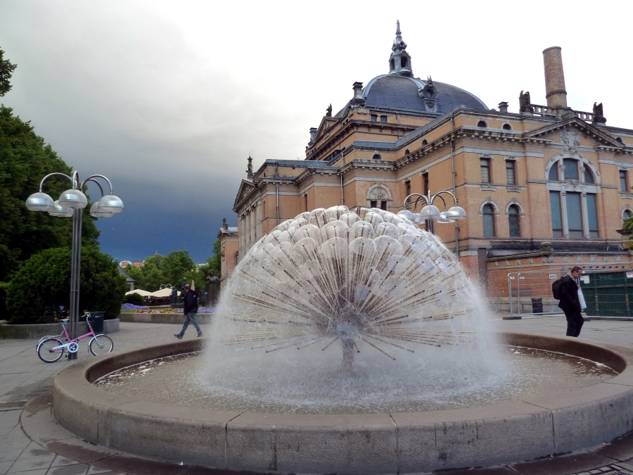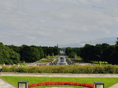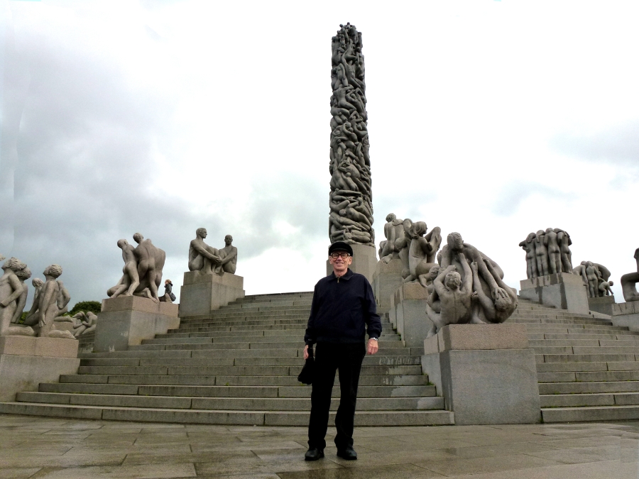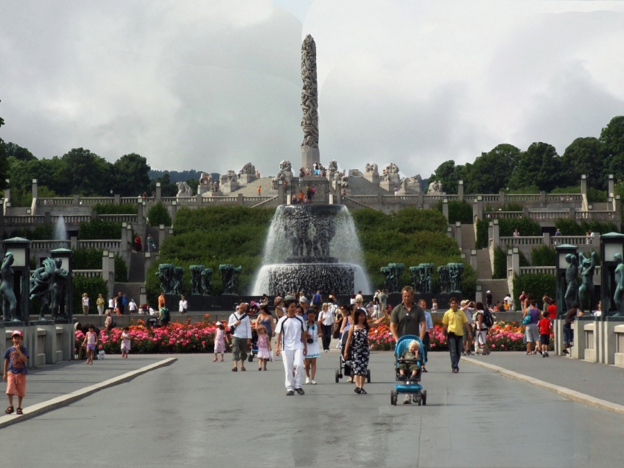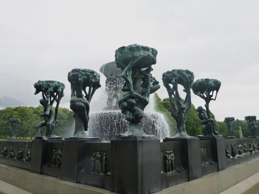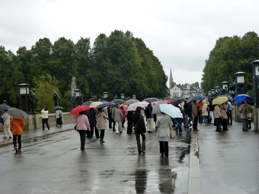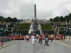 Turning into the city, we passed the Parliament (Stortingent), the National Theater (1899) with a very unusual fountain, the old University campus, the Royal Palace (1848)(at a distance), the Ibsen Museum (in his last home), the U.S. Embassy (with the American flag at half mast in memory of the 9/11 attack on the World Trade Center), and the National Museum of Art (1882). At 12:40 we finally arrived at Frogner Park, site of the world famous Vigeland Sculpture Arrangement. Here we had a one hour stop. Unfortunately, the rain, which had been off and on since we left the ship, was coming down hard for the first part of our visit. Then the sun came out and the rest of the day was beautiful. The Arrangement features 212 large bronze and granite sculptures. Personally, I was more impressed with the quantity of the sculptures than their beauty. Most of the more than 200 statues, all nudes, depict people engaging in various ordinary activities, such as running, wrestling, dancing, hugging, and so on. The original plan for the Arrangement included only the fountain and the "human trees" around it, but obviously the city fathers got carried away with their enthusiasm for Vigeland's work.