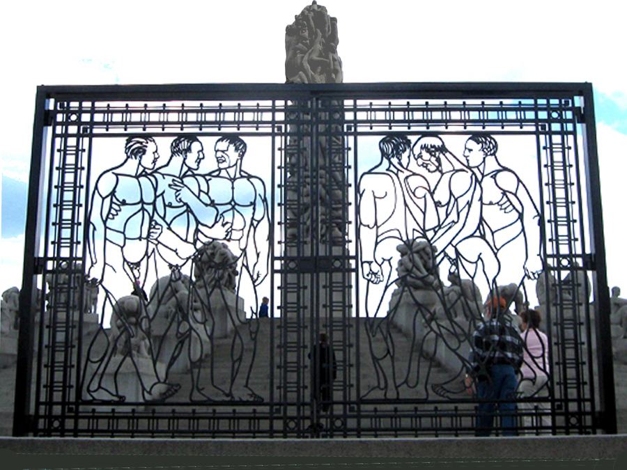 Shortly after the rain had stopped, a woman from our group lost her footing on the lower steps of the Plateau and fell backwards. Her injuries didn't seem serious, but she was taken away by ambulance. The tour was only slightly delayed. We left through the impressive iron gates, also by Vigeland, behind the Monolith Plateau.