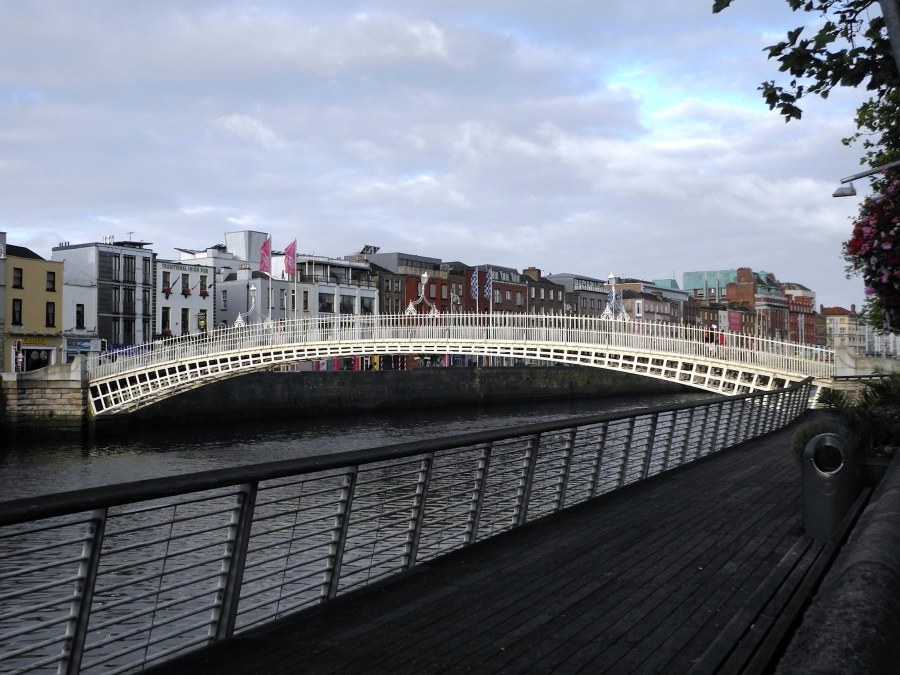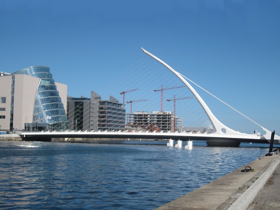 The Republic of Ireland has been independent of Britain only since 1923. Dublin, its capital, was founded by the Vikings as a trading settlement at the mouth of the River Liffey in 841. The modern city of Dublin is divided basically down the middle by the River, which flows into the Irish Sea. Our bus drove a short distance to the Liffey. The guide pointed out the O2 (formerly the Point Theater), Ireland's largest indoor venue, where a wide variety of performances are held, including by Riverdance, the popular Irish step-dancing group. We followed the river upstream (west) past the cantilevered Samuel Beckett Bridge (2009), designed by Calatrava. Just beyond it was the very modern Convention Center (2010). Further upstream we saw the Ha'penny Bridge (1816), an arched pedestrian bridge made of cast iron. There were occasional sailing ships moored in the river along the way.