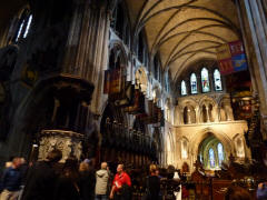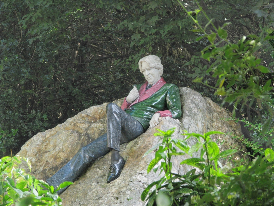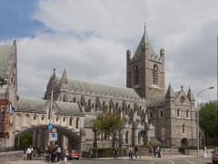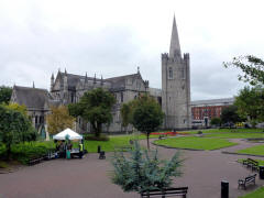We then drove west through the Temple Bar area of Dublin. Although there is a tavern there called the Temple Bar, that has been the name of this area on the south bank of the River Liffey since the 17th century. After falling into decay, it has since become a quite fashionable cultural quarter, one of the few neighborhoods that has preserved its medieval street pattern and many narrow cobbled streets. Further on, we got a glimpse of Dublin Castle as we rode by. The Castle boasts a tower dating to 1228, but most of the rest dates from the 18th century. Soon after, we passed the Christchurch Cathedral (founded about 1030). older of the two Church of Ireland cathedrals in Dublin. About 11:15 we stopped at St. Patrick's (founded 1191), the other cathedral and the largest church in Ireland. We spent almost an hour exploring St. Patrick's. Jonathan Swift, author of Gulliver's Travels, once headed this cathedral. The bus had to go east again to get to the highway to Glendalough, and we soon found ourselves back at St. Stephan's Green. This time we passed Mansion House (1710), residence of the Lord Mayor. Then we had a brief photo stop on a nearby street lined with Georgian-style buildings, many with colorful doors. On the way we also passed Merrion Square with a very unusual statue of Oscar Wilde (famous Irish writer) reclining on a large rock. The colorful figure is not painted, but made of various color stones. Finally the bus headed southeast toward the coast road to Glendalough in County Wicklow, one of Ireland's most scenic counties. It was a little after 1:00.