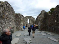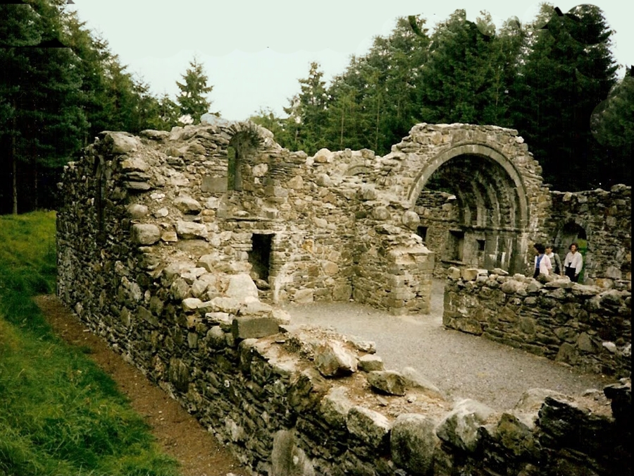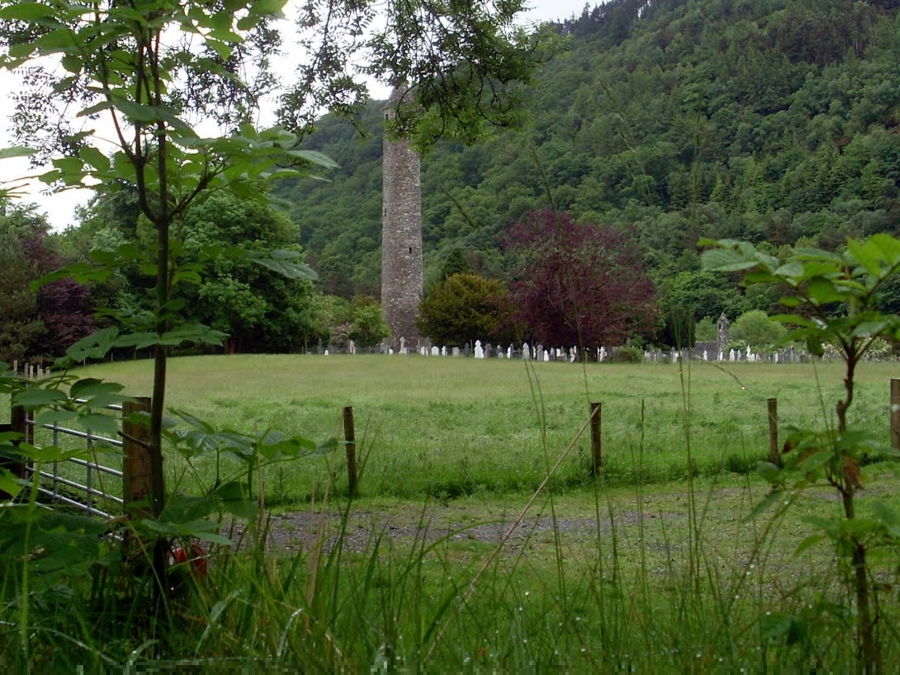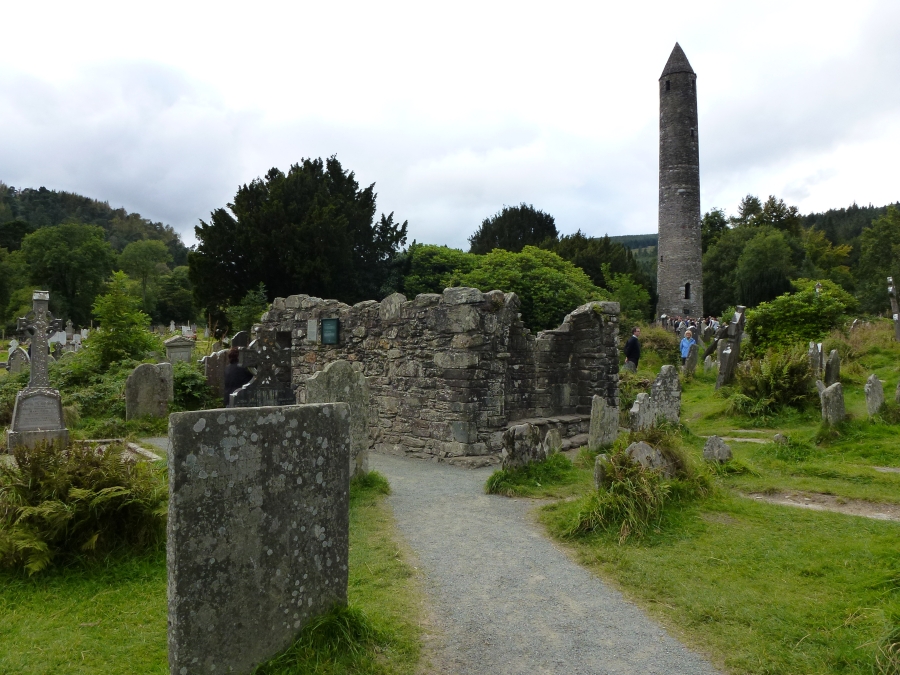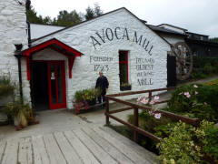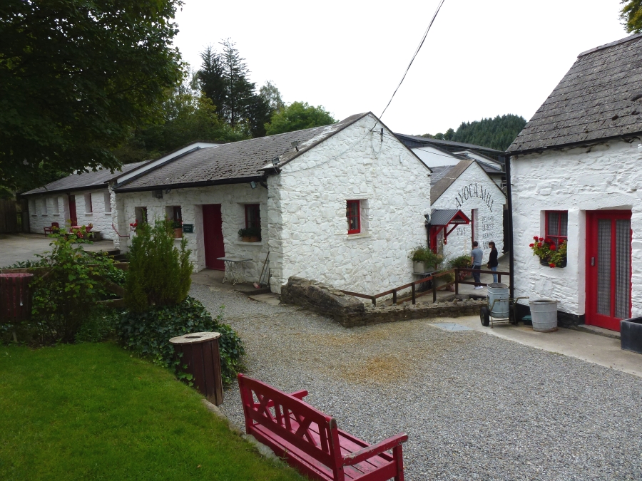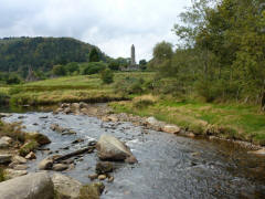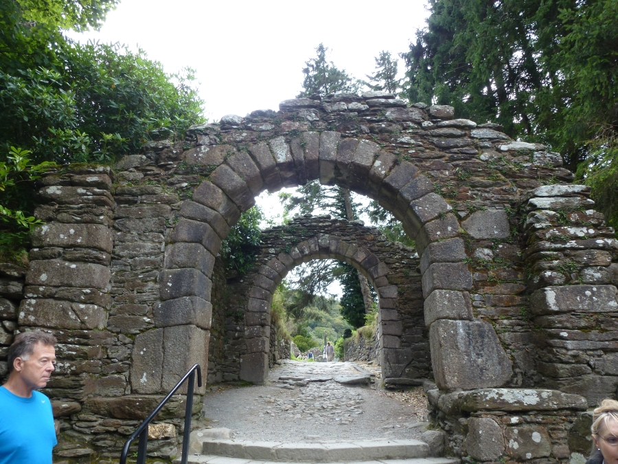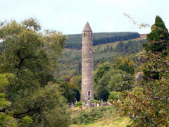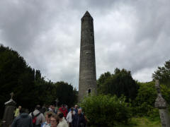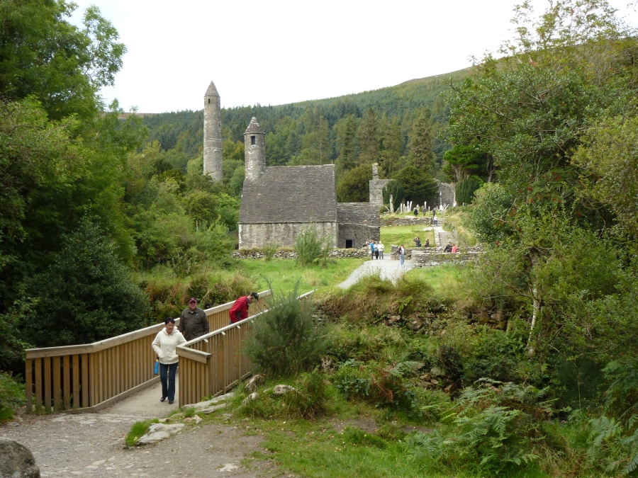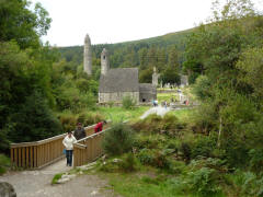 We past many sheep in the fields. They were "branded" with blotches of dye to mark ownership. Soon there were mountains to the west, and we passed close to Little Sugar Loaf Mountain on our east. After passing the town of Wicklow, we turned off the highway and followed narrow country roads to the small village of Avoca. Our destination was actually the Avoca Mill outside the village. We arrived a little before 2:00 and had half an hour on our own. This is said to be the oldest wool mill in Ireland (1723). They had beautiful sweaters and other items for sale, but the prices were steep and the clothing is probably too warm for American homes. The bus then took us to the Woodenbridge Inn in the town of Arklow for a three course lunch. We could see Great Sugar Loaf Mountain in the distance as we rode. We left Arklow about 3:30 and drove to Glendalough, passing through through the small village of Rathdrum. We arrived about 4:15.