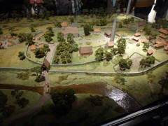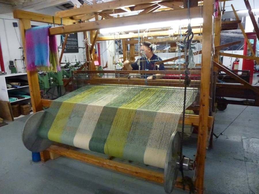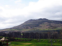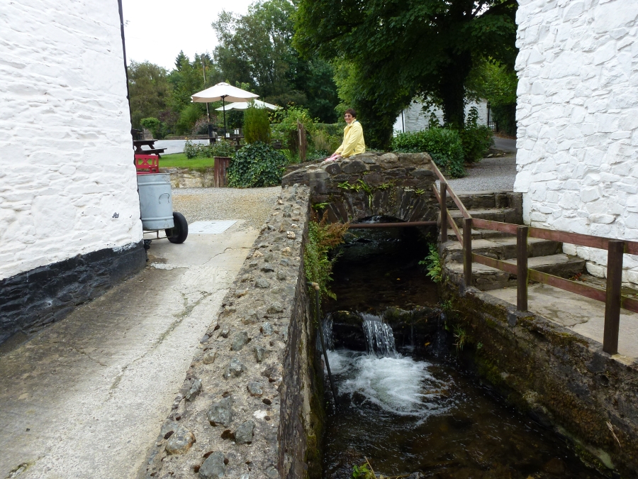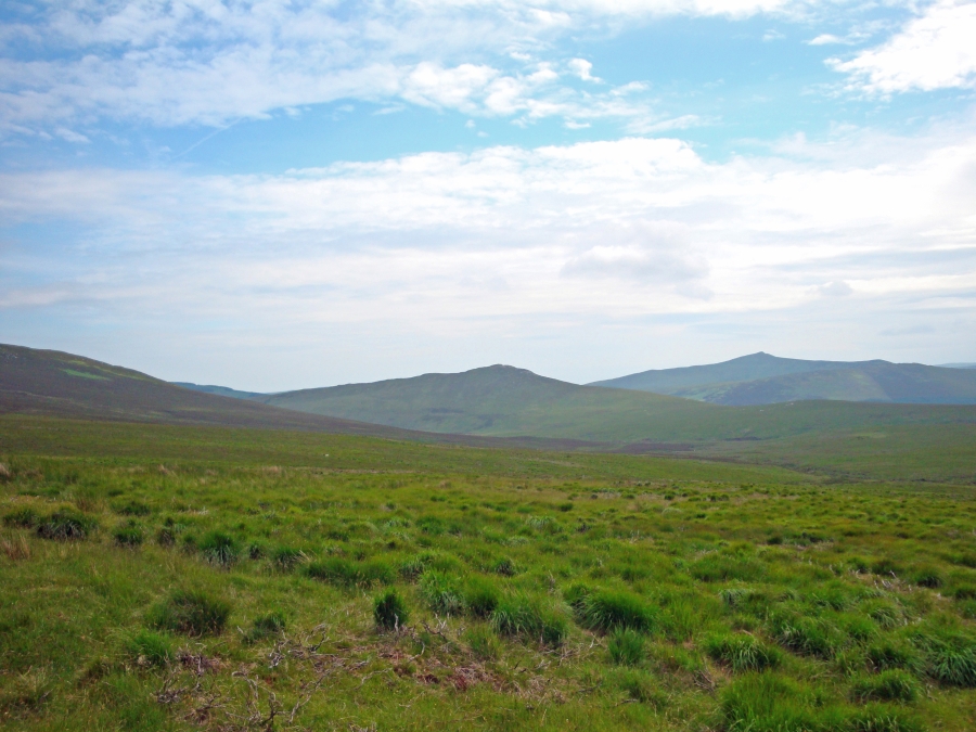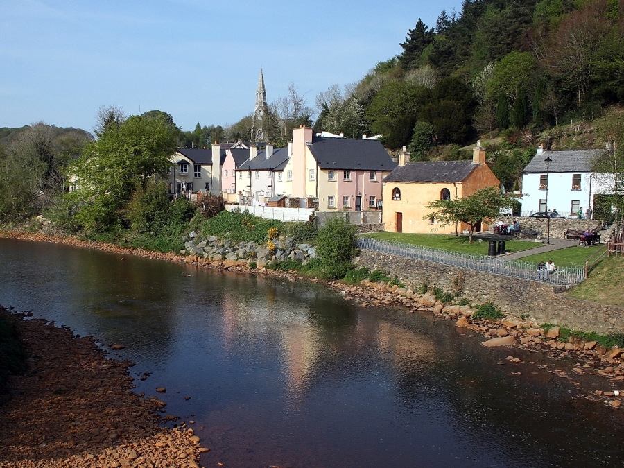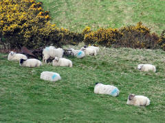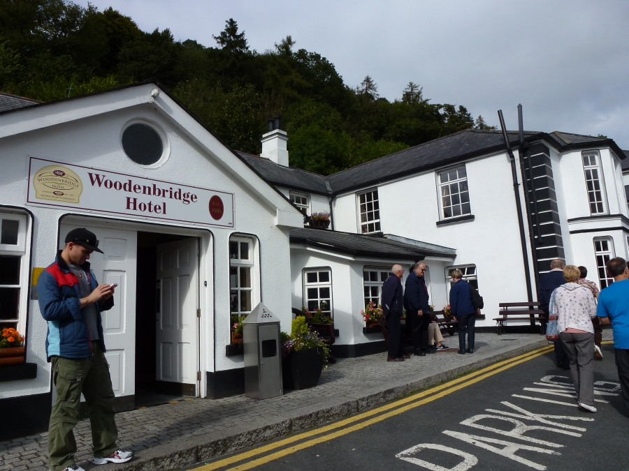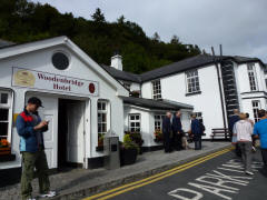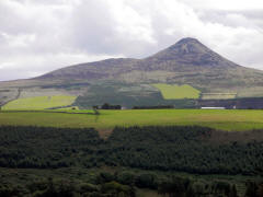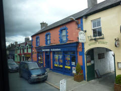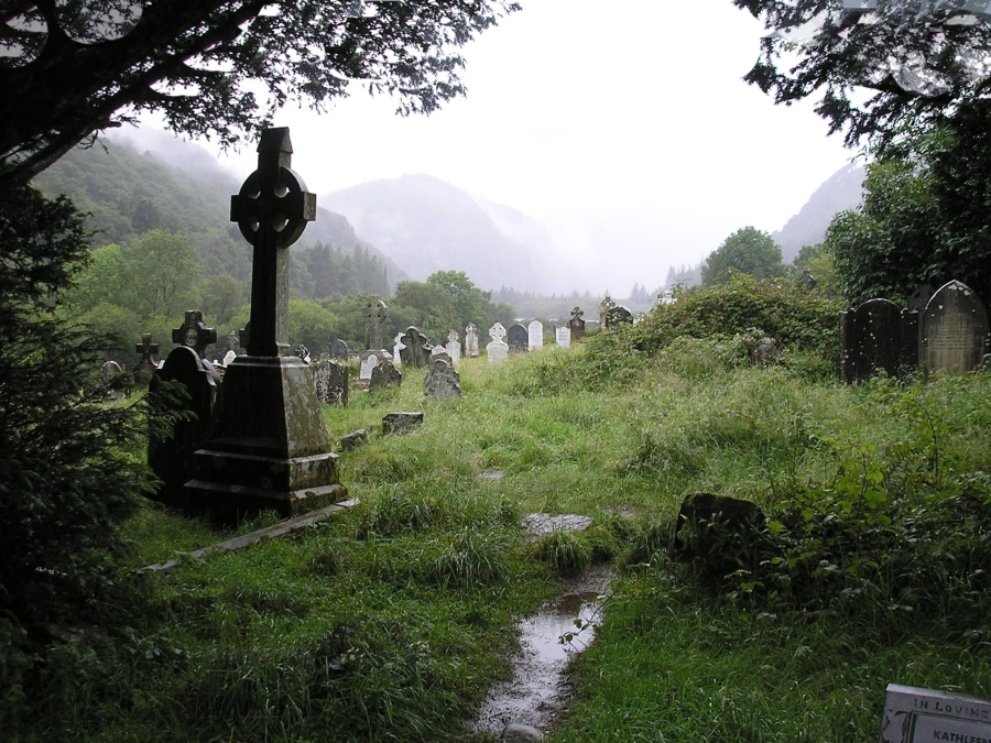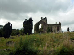 We past many sheep in the fields. They were "branded" with blotches of dye to mark ownership. Soon there were mountains to the west, and we passed close to Little Sugar Loaf Mountain on our east. After passing the town of Wicklow, we turned off the highway and followed narrow country roads to the small village of Avoca. Our destination was actually the Avoca Mill outside the village. We arrived a little before 2:00 and had half an hour on our own. This is said to be the oldest wool mill in Ireland (1723). They had beautiful sweaters and other items for sale, but the prices were steep and the clothing is probably too warm for American homes. The bus then took us to the Woodenbridge Inn in the town of Arklow for a three course lunch. We could see Great Sugar Loaf Mountain in the distance as we rode. We left Arklow about 3:30 and drove to Glendalough, passing through through the small village of Rathdrum. We arrived about 4:15.