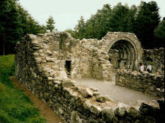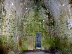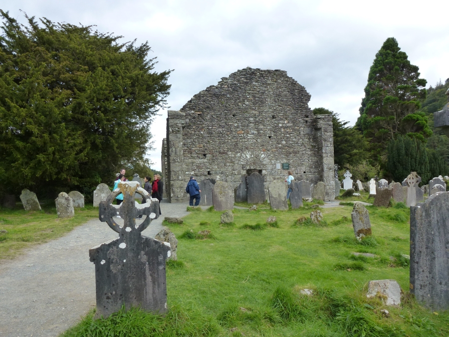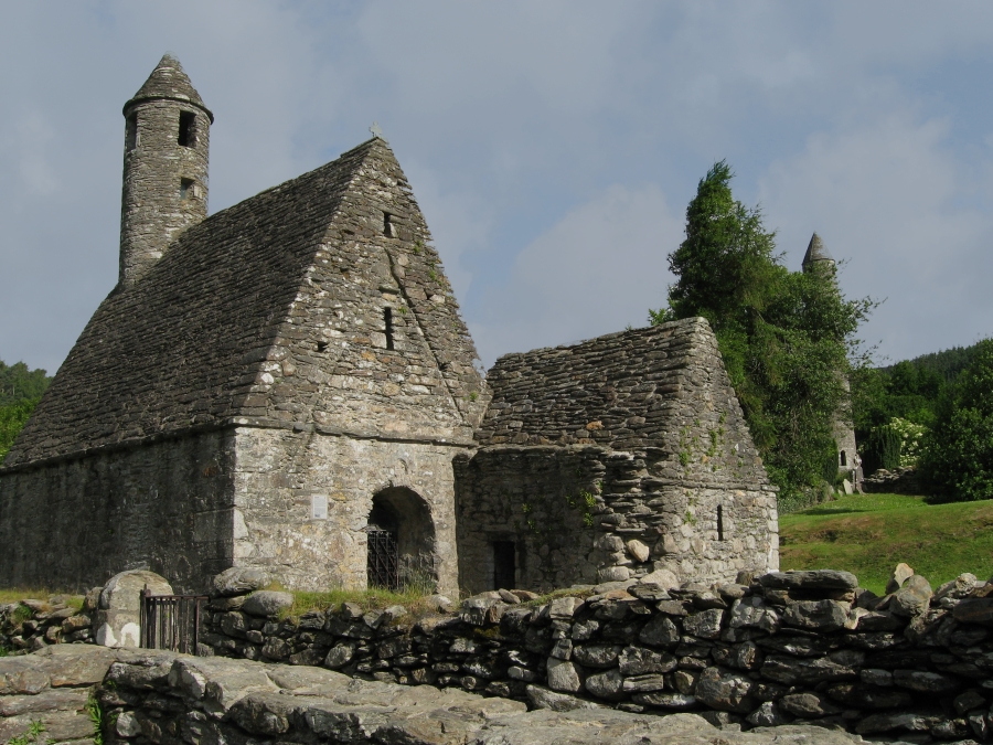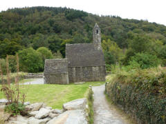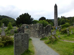 The largest remaining ruin on the grounds is the Cathedral (about 1200), but only the shell of the nave is left. There are ruins of several other small churches as well, consisting mostly of a few crumbling walls. The most interesting and best preserved (or restored) of the old churches is St. Kevin's Church, situated down a hill from the tower and the main ruins. It has a very unusual stone roof. Such roofs have no underlying supports, other than the semi-circular vaulted ceiling below; they rely for support on the careful overlapping of the stones.