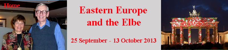 AND THE ELBE Introduction. Jane and I had our eye on the 12-day Grand Circle Travel (GCT) Elbe River cruise since it was introduced a few years earlier. It included visits to places in the former East Germany that we'd never seen, most notably Dresden and Meissen, as well as others we'd not been to for many years (Prague, Berlin). When GCT improved the itinerary in 2013, we decided to take it. Since we were flexible as to dates, we also elected to book it within 60 days of the departure date when large discounts are often available. So just a few weeks in advance, we signed on for the 28 September-10 October cruise. This "cruise" was different from most of the other river cruises we'd taken in that only seven of the eleven days in Europe were on the ship. That meant unpacking and repacking three times instead of just once. Getting There Thursday-Friday, 26-27 September. We arranged to fly to Europe out of Liberty Airport in Newark, NJ. This gave us an opportunity to celebrate Jane's 82nd birthday with our son Larry and his family, who live in Glen Ridge. We left our home in Massanutten, VA, around 10 a.m. Thursday and got to Glen Ridge at 4:00. We spent a pleasant couple of days visiting with Larry and Mina. On Friday their lovely daughters Andria, 23, and Stephanie, 21, arrived, and the six of us celebrated Jane's birthday at a local Italian restaurant. Saturday, 28 September. We spent a leisurely morning with Larry's family before packing up for the trip to Europe. Larry and Mina got us to Liberty Airport around 2:00. Our 4:40 United flight was only a few minutes late taking off. The evening meal was served about 7:00. Then we tried to sleep but, as usual, with the tightly crammed seats it was a losing battle. Prague