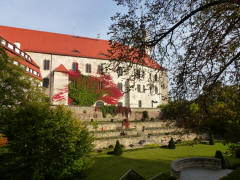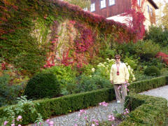 The Castle church here was the first Protestant church building in Germany built in accordance with Luther's own ideas. Luther consecrated it in a festive service in 1544. We walked back out the gate and a block down Wintergreen Street to St Mary's Church where Martin Luther's wife (Katharina von Bora) is buried. Then Jutta led us inland to the large Markt Platz. The dominant building here was the Town Hall (1563-1578). The oldest building on the square was St. Nicholas Church (13th century). There were also historic Burgher's homes, as well as a large fountain with bronze figures of "Fools and Musicians", built in 2000 to replace a medieval one. At this point we were given free time to explore on our own. Jane and I walked down some of the side streets, then headed back toward the Castle entrance. Just before we reached it, we saw a sign to the rose garden and we turned in there. The gardens were beautiful but there weren't any roses in October. The turning leaves, many of them crimson, were the most colorful vegetation. As we were admiring the colors, a dog raced across the garden and jumped into an urn filled with rain water. He was still there when we left. We walked through the garden along the castle until we came to a small gate leading to the street along the Elbe. We came out very close to the Elbe Monument and our ship. We were back on board at 4:00. At 5:00 we attended a lecture "East Meets West" about the meeting of the Soviet and American armies in 1945. Apparently the first linkup occurred elsewhere, about 20 mile south of Torgau, but due to a mistake in the coordinates reported, was not verified until after linkup ceremonies had been arranged at Torgau.