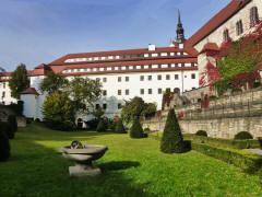 Next we walked to the gate leading into the courtyard of Hartenfels Castle (built 1485-1623), really more of a palace. As we crossed the bridge leading to the gate, we saw there were brown bears in the moat. The Castle has a distinctive outdoor spiral staircase that seems to defy gravity. There were tables set up throughout the courtyard, most occupied by people eating. We found out that this was a charitable fund raising event to raise money to feed the hungry - by feeding the donors.