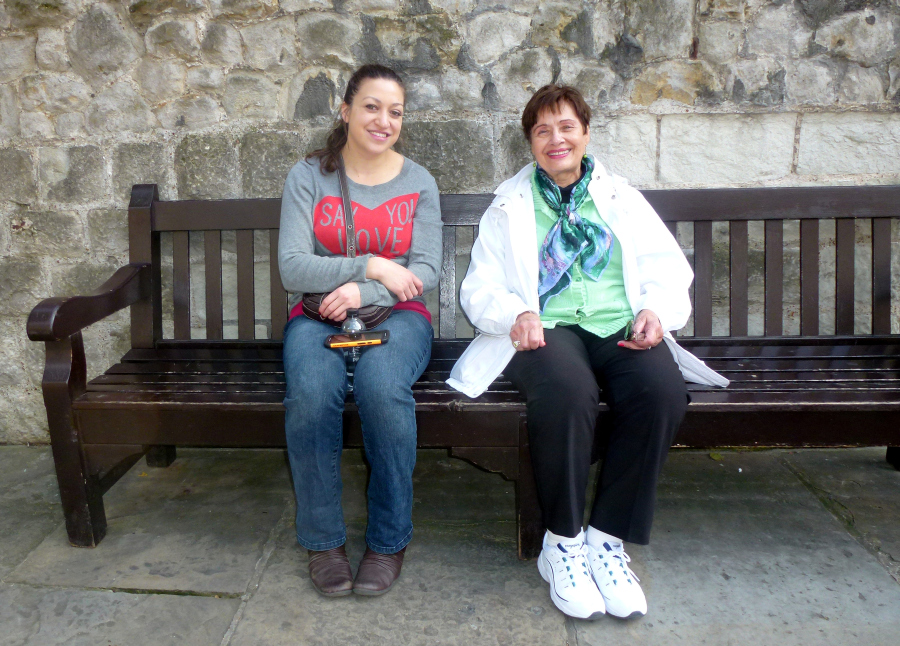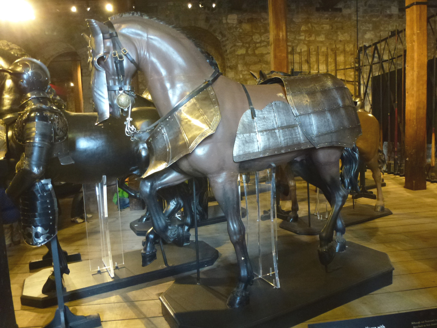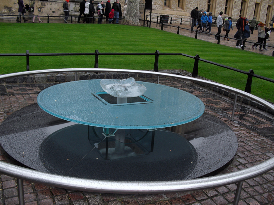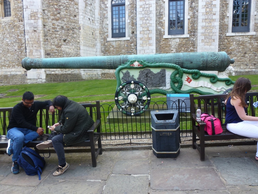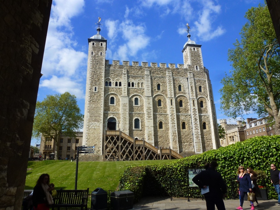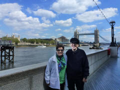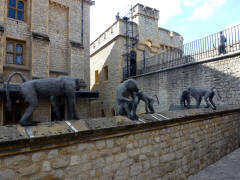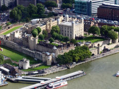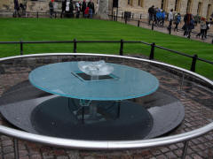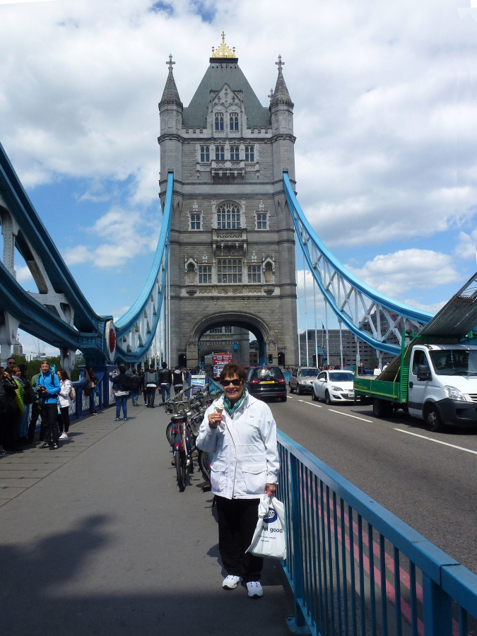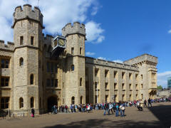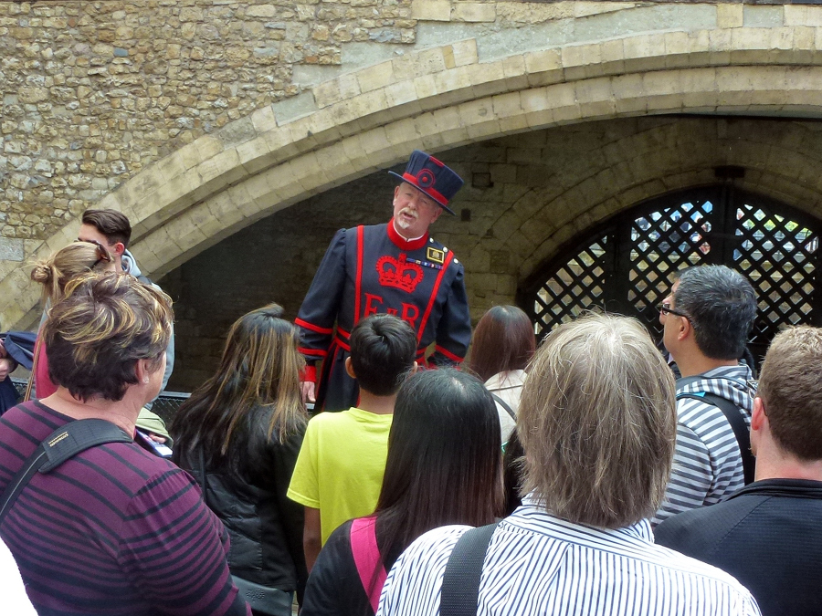 We took the tube to London Bridge Station. Liz's job was at a huge gym nearby, and our first stop was to tour that. Then we walked along the Thames and crossed Tower Bridge to the Tower. Despite its name, the Tower of London is not a tower, but a combination of buildings. It was started by William the Conqueror in 1072 and has constantly been improved and extended ever since, serving as a castle, fortress, prison, library, mint, treasury, bank, arsenal, palace, and now a museum. There are actually several towers within the Tower. The oldest and most prominent is the White Tower, originally the central keep begun by William the Conqueror. Its walls are 15 feet thick. It now houses an exhibition of arms, armor and torture instruments. We arrived at the Tower about 14:00 and bought tickets for the 14;30 tour. I was shocked to find that there were at least 100 people on our tour, compared to six when we were here in 1961. Our Beefeater guide was great and had a powerful voice, but outside it was hard to get close enough to hear him. When he led us into the Chapel Royal (1520), however, where we spent at least half of our 30-minute tour, his booming voice was more than adequate. Many famous prisoners executed at the Tower are buried under the Chapel floor, including Anne Boleyn, Catherine Howard, Lady Jane Grey, Thomas Cromwell, and Thomas More. The "scafold," or place of execution, was nearby. Just a patch of grass when we saw it before, it is now covered with bricks and sports a fancy circular monument completely out of keeping with the original site. We had intended to visit the Jewel House next, but the line was much too long. So we all went into the White Tower instead. It was jammed with people. We had only covered one floor when the heat started getting to Jane. She and I went out and found a bench in the shade while Andy and Liz finished touring the White Tower exhibits. They found us about 16:20 and we all walked around inside the Tower walls, stopping to visit the royal apartment near Traitor's Gate.