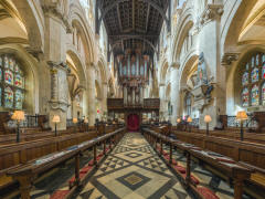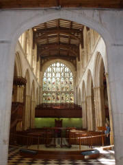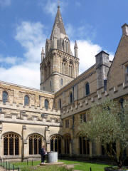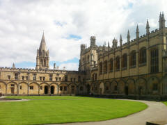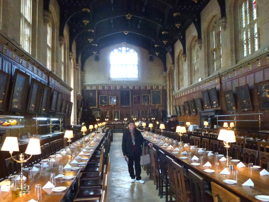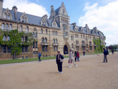 College. Christ Church, under that name, was founded by Henry VIII in 1546, but Cardinal Woolsey had started building it in 1520, and there had been a priory (monastery) on the site since 1122 (some of which is incorporated into the present cathedral). We were leisurely browsing around in the general direction of the cathedral when various people told us that we had to rush to see "The Hall" because it was about to close to the public while lunch was served. (It was 11:40.) We rushed in the direction they indicated, up a flight of steps and into the hall. It was truly impressive, but also somewhat familiar. This hall was part of Cardinal Wolsey's construction (1520), but a replica was used as the dining hall at Hogwarts in the Harry Potter movies.
