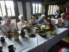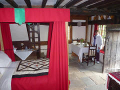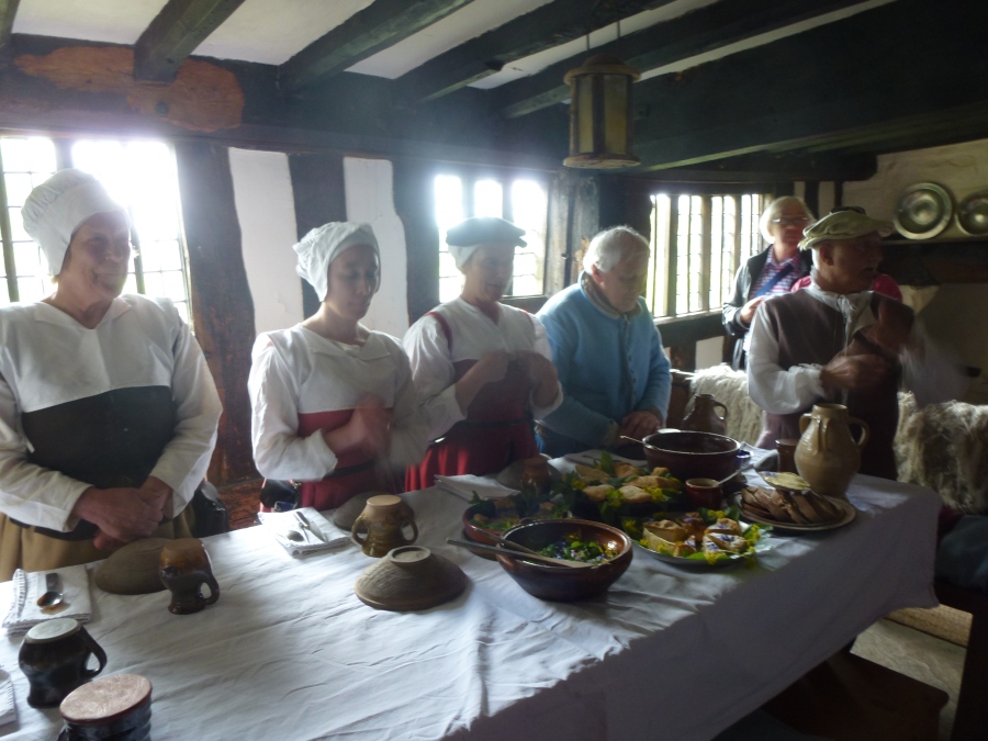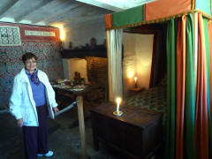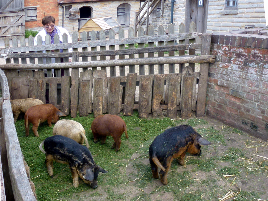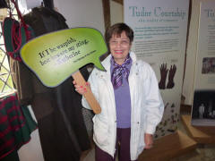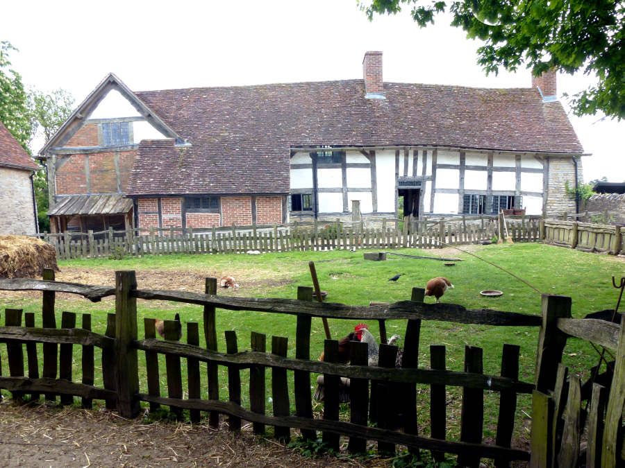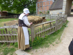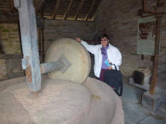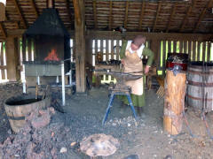 Much has been written about the relationship between Anne and William, but most of it is wild speculation based on the few known facts: Anne was 26, William 18, when they married, and she was pregnant. They seldom lived together, but they still had three children. The only mention of Anne in his will was to leave her "the second best bed." We left the cottage, and Lee drove us to the Mary Arden Farm in the village of Wilmcote, just a few minutes away. This farm was once owned by Shakespeare's mother, Mary (although the house originally thought to be hers turned out to be that of a neighbor, Alan Palmer). It was after 12:30 when we arrived, but we decided to wait to get something to eat even though there was a snack bar near the entrance. We stopped to watch the lady blacksmith, then continued past several other exhibits. After going through the Great Barn, we spotted the large farmhouse (Alan Palmer's, not Mary Arden's) and walked in that direction. We passed a mill and came to the fenced barnyard where various fowl were penned.