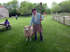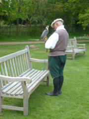 slipped out as the meal continued.We headed back to the snack bar, hoping to have an "afternoon tea." We had learned by this time that the afternoon tea was the "big" tea, larger than a cream tea. Jane was hungry and insisted that we order two, rather than share one. It turned out the this place had the most generous tea we have seen of any kind. We got two very large pots of tea, two full sandwiches (four halves), two very large scones with clotted cream, two smaller rolls, and two very large pieces of cake. It was difficult to finish it all - but we did. One would have been more than sufficient for the two of us. It was after 14:00 when we went back out to finish our tour of the farm. After seeing several more types of farm animals, we noticed that the falconer (who turned out to be "the master") was about to begin a demonstration. He had a string around the falcon's leg so it could not fly away. Not to worry. No matter how much he coaxed the falcon, it would not leave the bench where it was perched. After 15 minutes we finally gave up and started toward the farm's exit. We ran into a shepherd with a large sheep. After spending about ten minutes with the shepherd, we looked back and the falcon still had not moved.