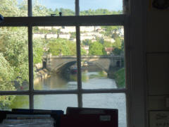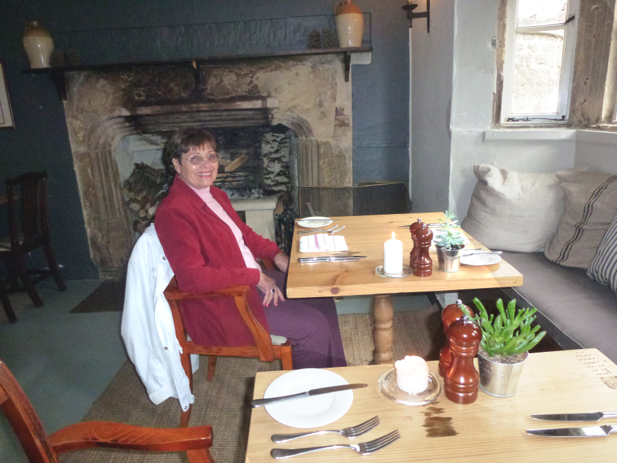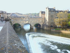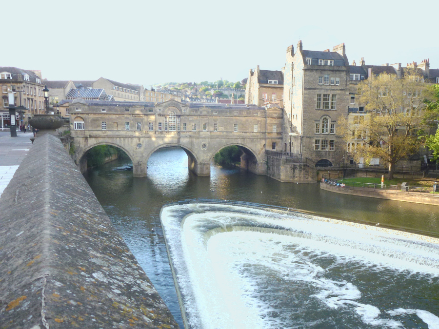 We followed a pretty lane back to the center of the village. It was about 16:15 when Lee bought each of us cream tea at a small pub. It was most welcome after our light lunch. It took us another hour to reach the Abbey Hotel, right in the center of Bath. Lee checked us in about 17:00, then left for the night. We rested for a while and partially unpacked for our two-day stay. I went out to look around and found that our hotel was right along the River Avon and also that we were only about a block from Bath Abbey. About 18:30 we both went out to find a place for dinner. The hotel desk recommended Joya, near the Pulteney Bridge, so we walked north along the Parade Gardens to the river. From there we could see the bridge. There was a weir below it creating a v-shaped rapids. The Pulteney Bridge (1744) resembles the Ponte Vecchio in Florence in that it is completely lined with shops on both sides all the way across. We crossed it and briefly looked around before crossing back. We spotted the Joya up the street and had dinner there. The place was bustling and very noisy, but the food was really good. It was about a ten minute walk back to the hotel.
