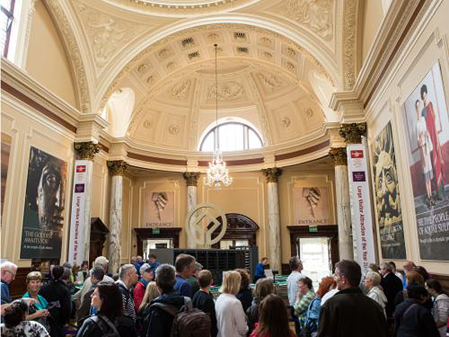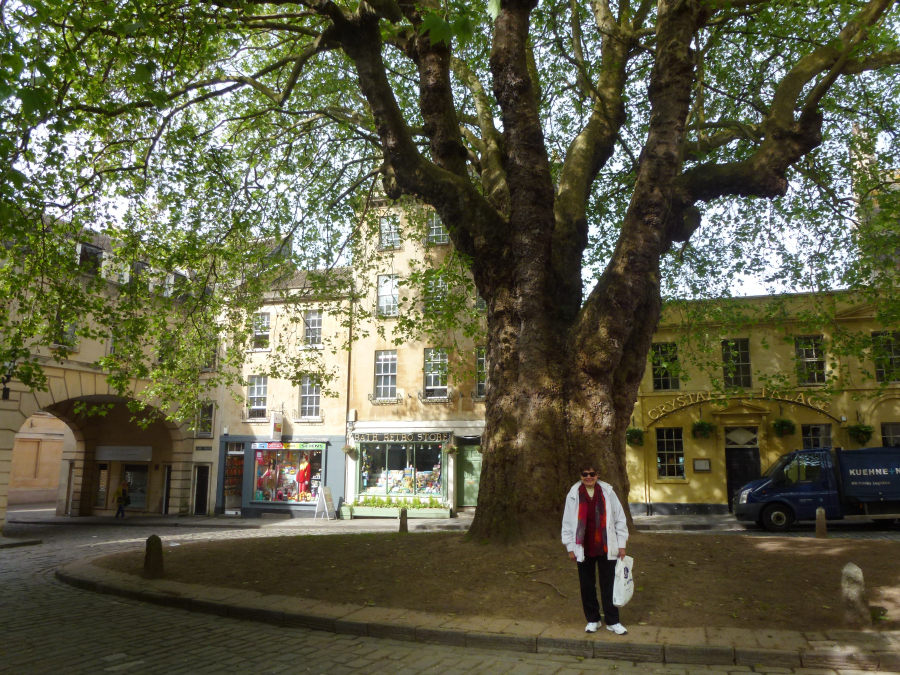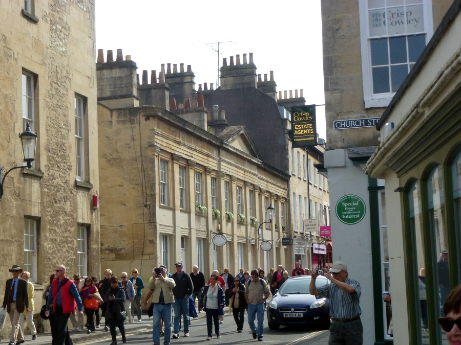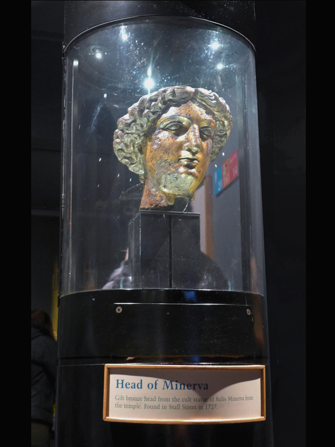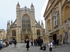 When the tour ended, we merged back into the huge mob trying to push its way through the exhibits. The exhibits were interesting, too, but the crowds precluded getting more than a glimpse here and there. We could never see a complete display. The audio guides were absolutely useless, designed for a solo stroll though an empty gallery by someone with six hours to kill. We spent just about two hours inside the baths. Connected to the Roman Baths was a walkway leading through the ruins of the Temple Courtyard to the site where the Temple of Minerva had been. A display included the gilded copper head of the statue that stood in the Temple. We exited the Roman Baths just after 11:30, The exit was some distance from the entrance, so we had to walk back to Bath Abbey Square where Lee was waiting for us.