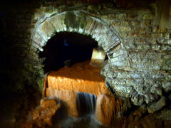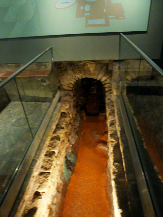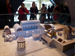 But the water kept flowing and the spring was graced with new buildings periodically over the centuries. In the 18th century the underlying Roman buildings were rediscovered during an effort to improve the water flow. They have been excavated, restored and embellished over the ensuing years, mostly in the Victorian era. As we entered, we found ourselves in the Victorian reception hall. It was pretty much of a madhouse inside, with little guidance to the mob of visitors. We were given audio guides, but we saw a sign that there was also a free guided tour. Unfortunately, the only information we could get about it was that it was "downstairs." As we went out the back door of the reception hall, we found ourselves on a rectangular terrace that formed the roof around a large atrium below. We followed the terrace around to steps leading down to the Great Bath, a large open air pool. (All the superstructure above the level of the column bases around the Great Bath is from the Victorian era or later.) Walking around the pool, we could see the top of the nearby Abbey towering over the Great Bath. We also found the entrance to the old Roman baths. As we left the model, we were suddenly swallowed up by such a tightly packed crowd that it was impossible to see anything in perspective. Soon we were walking through a twisting museum corridor lined with exhibits. But there was no sign of any tour. We turned back after several minutes and eventually spotted an attendant who offered to lead us to the tour. We walked back the way we had just come, then down another crowded area until we finally found and joined the guided tour, already in progress. There were only two other people taking it, small wonder when it was so hard to find.